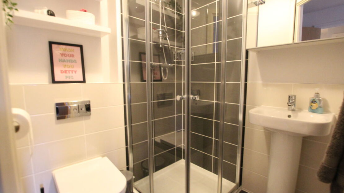 Single panel radiator, modern three piece white suite comprising of low level W.C, wash hand basin, fully tiled shower cubicle, extractor fan, tiled floor.