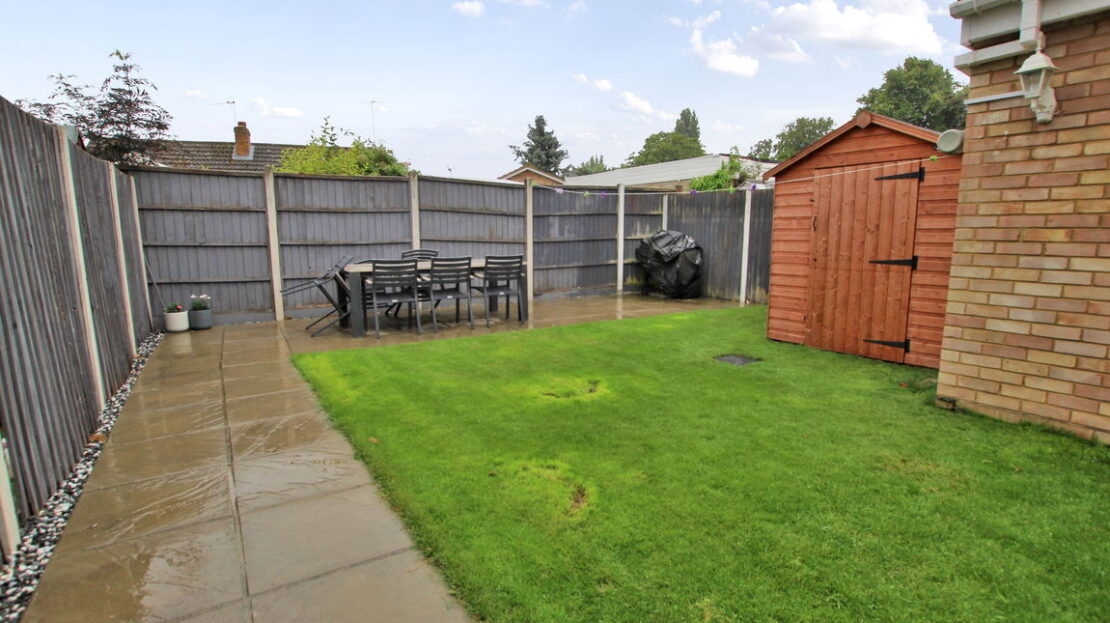Mainly laid to lawn, paved patios and pathway, timber garden store/shed, enclosed by 6′ timber panel fencing.