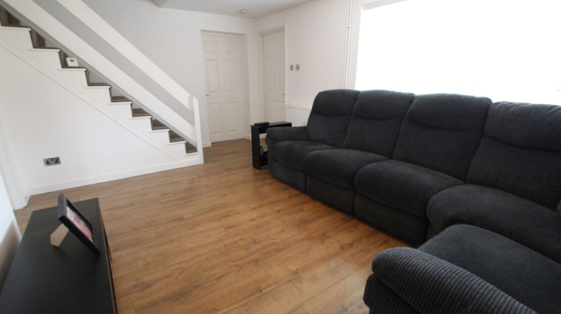 uPVC double glazed window to front elevation, double panel radiator, laminated wood effect flooring, stairs rising to first floor, doors to: