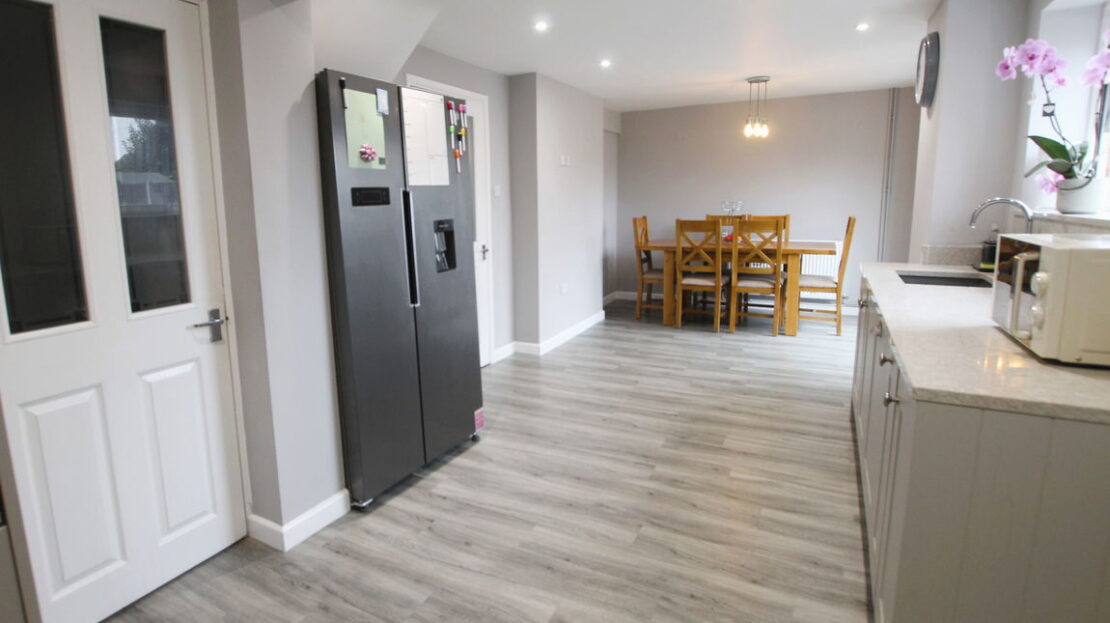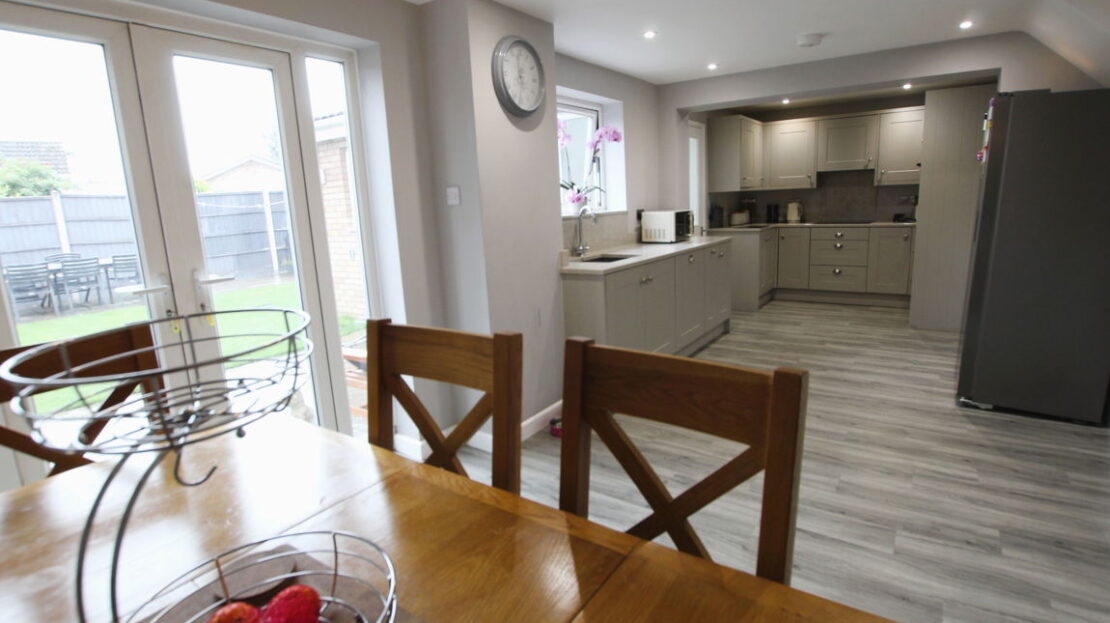 Twin uPVC double glazed doors and side windows to rear elevation, further uPVC double glazed Kitchen window to rear elevation, double panel radiator, extensive modern fitted kitchen comprising of single drainer sink unit with mixer tap over, feature quartz work surfaces with cut drainer, range of base units incorporating built-in Bosch induction hob and Bosch electric oven with separate grill, built-in dish washer, space for American style fridge freezer , matching range of wall mounted units incorporating extractor hood, ideal area for table and chairs. laminated wood effect flooring, doors to: