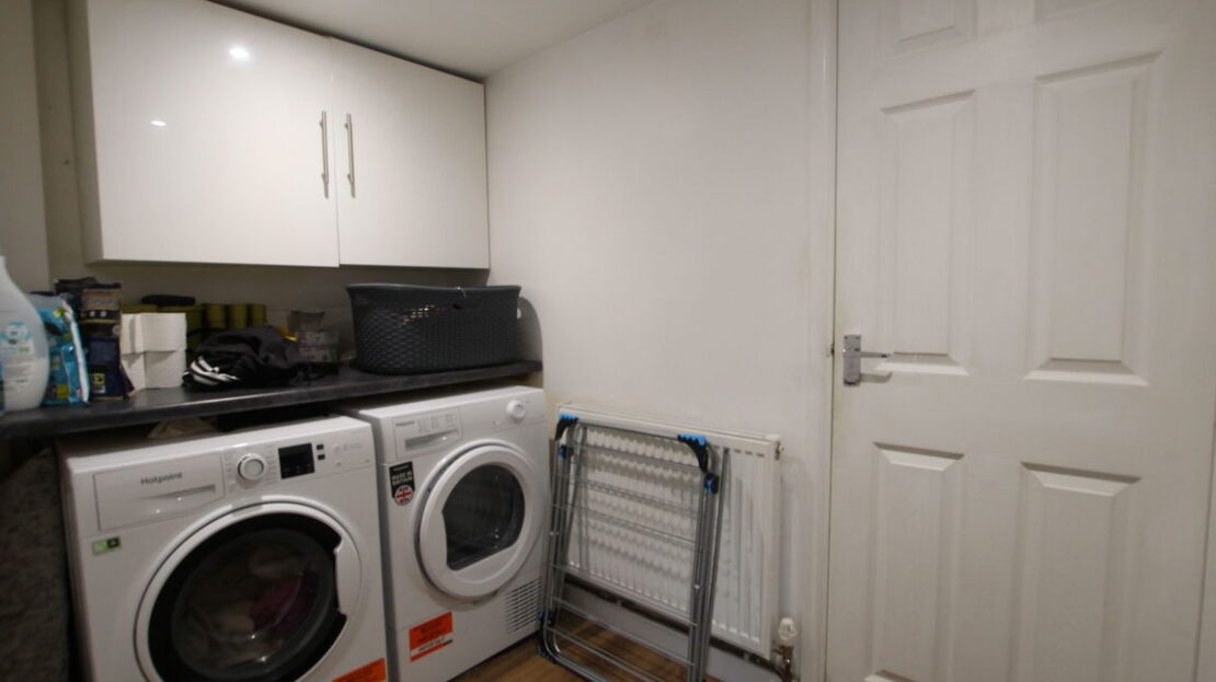 Single panel radiator, roll top work surface, plumbing for washing machine, space for tumble dryer, wall mounted unit, recess storage area, laminated wood effect flooring.
