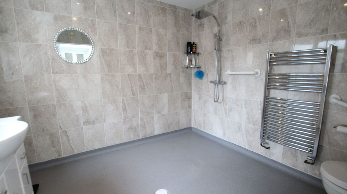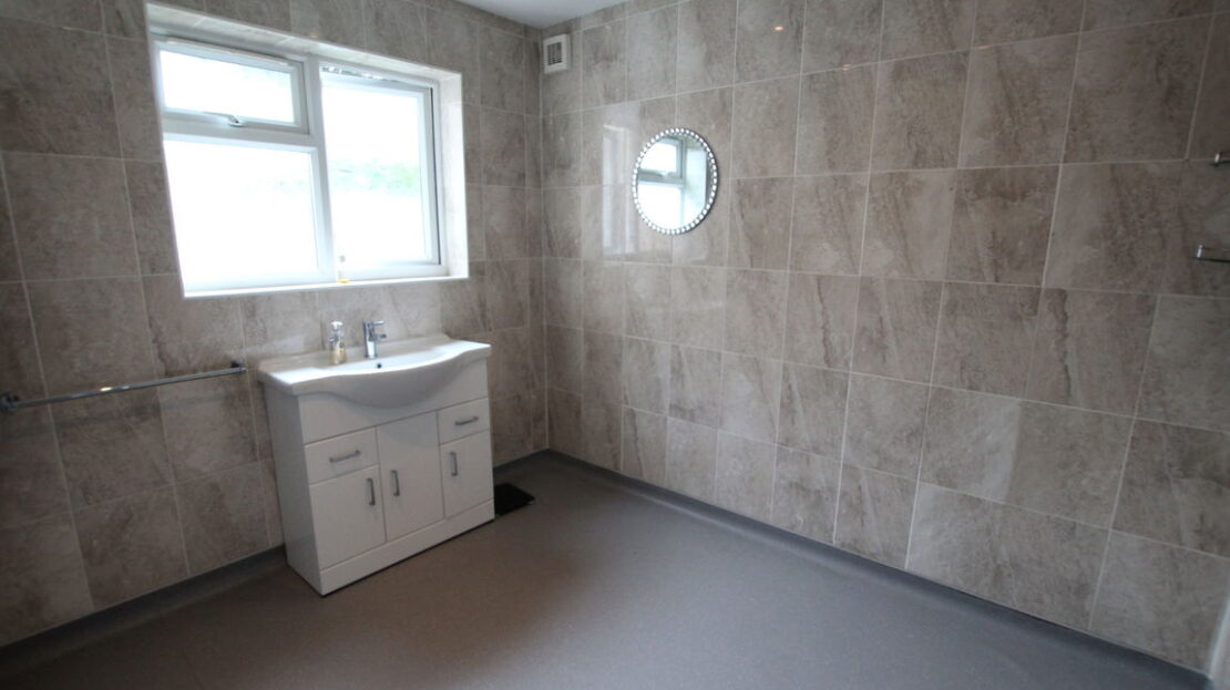 uPVC obscure double glazed window to side elevation, single panel radiator plus chrome vertical towel rail/radiator, modern white suite comprising of low level W.C, wash hand basin, fully tiled wet room with shower and central floor level flush soak away.
