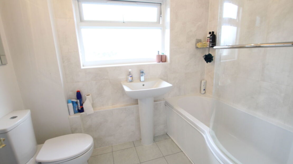 uPVC obscure double glazed window to rear elevation, chrome vertical towel rail/radiator, three piece suite comprising of low level W.C, wash hand basin, ‘P’ shaped panel bath with mixer tap plus watering can style shower over, tiling to two elevations and bath area.