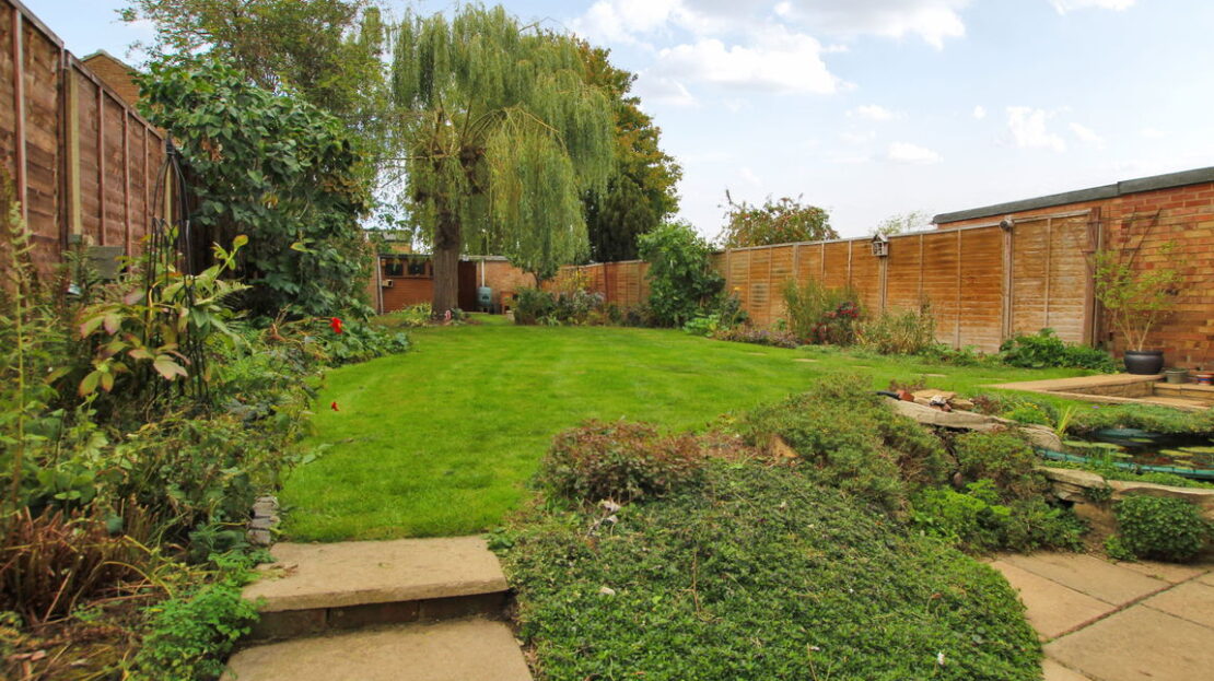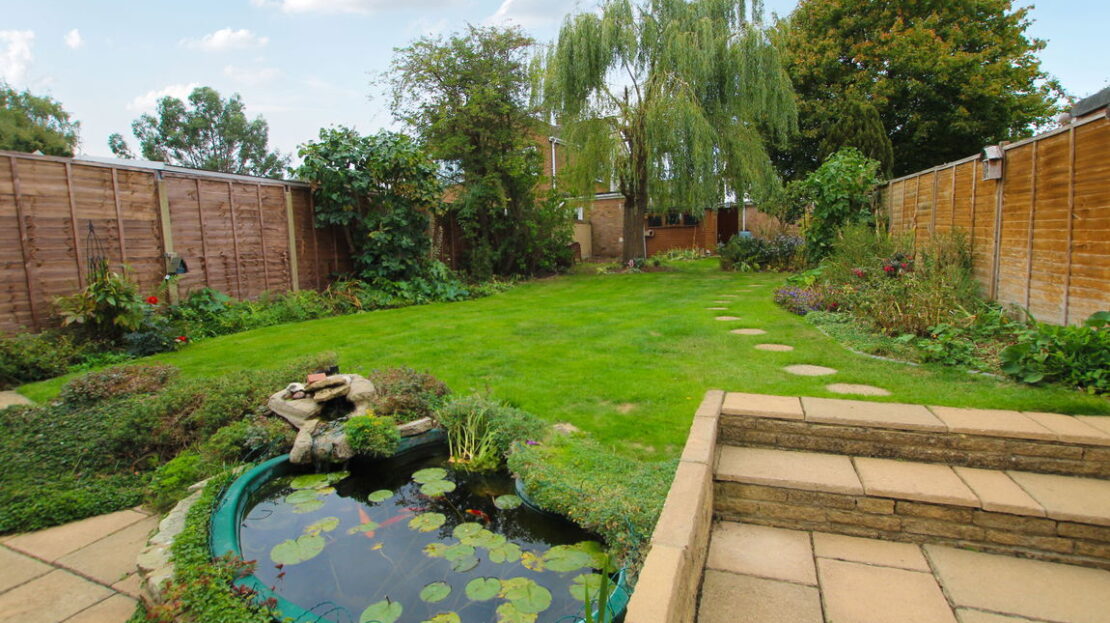 A generous mainly laid to lawn established rear garden in excess of 80ft in length (including the Conservatory), extensive paved patio with pond, rear 8ft X 6ft timber garden store/shed, side covered porch area.