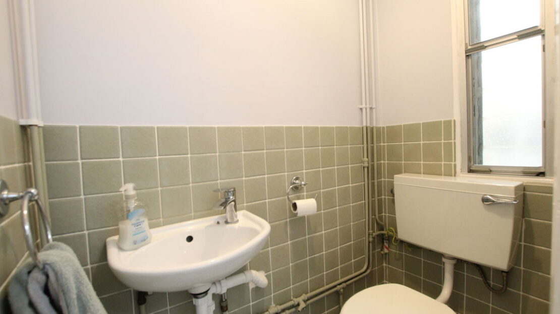 Single panel radiator, two-piece white suite comprising of low level W.C, wash hand basin, tiling to dado height.