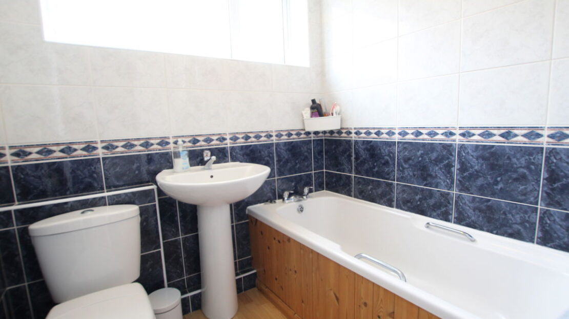 Fully tiled modern suite with uPVC obscure double glazed window to side elevation, vertical towel rail/radiator, three piece suite comprising of low level W.C, wash hand basin, panel bath with shower/mixer tap over plus fitted folding screen.
