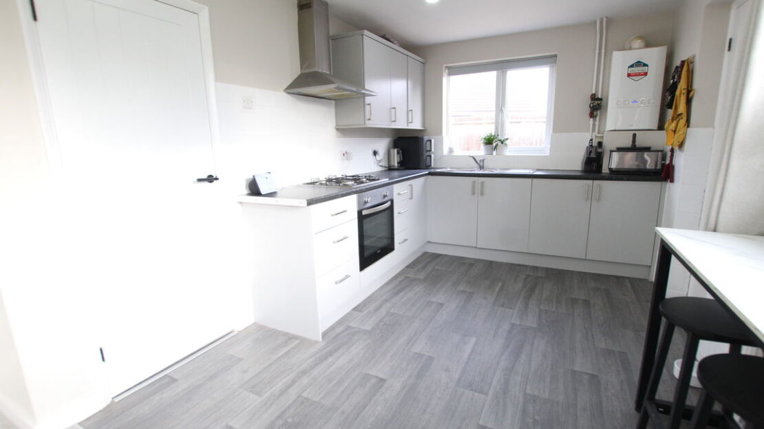 Dual aspect room with uPVC double glazed windows to rear and side elevation, double panel radiator, fitted kitchen comprising of single drainer stainless steel sink unit with mixer tap over, roll top work surfaces, range of base units incorporating built-in stainless steel gas hob and electric oven, tiling to splash areas, matching range of wall mounted units incorporating stainless steel extractor hood, fitted breakfast bar, door to: