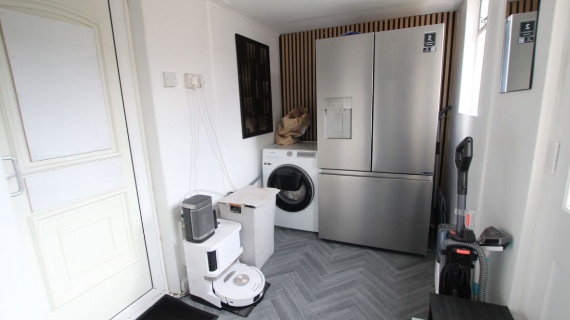 Window and door to side elevation to garden, further door to opposite side elevation to garage and driveway, plumbing for washing machine, space for fridge freezer.