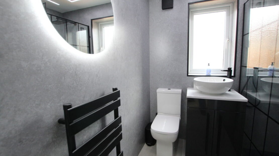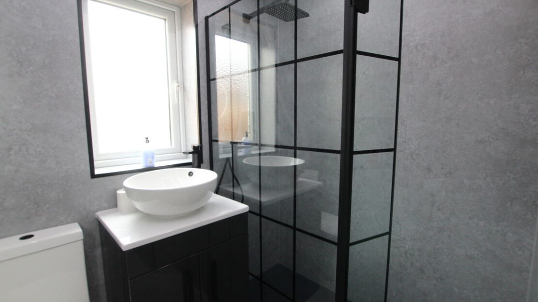 Now redesigned to a shower room with uPVC obscure double glazed window to side elevation, vertical towel rail/radiator, refitted three piece white suite comprising of low level W.C, free standing bowl wash hand basin on vanity unit, 1500mm walk in shower with Rainfall showerhead plus second rinsing attachment.