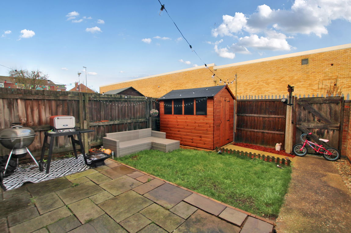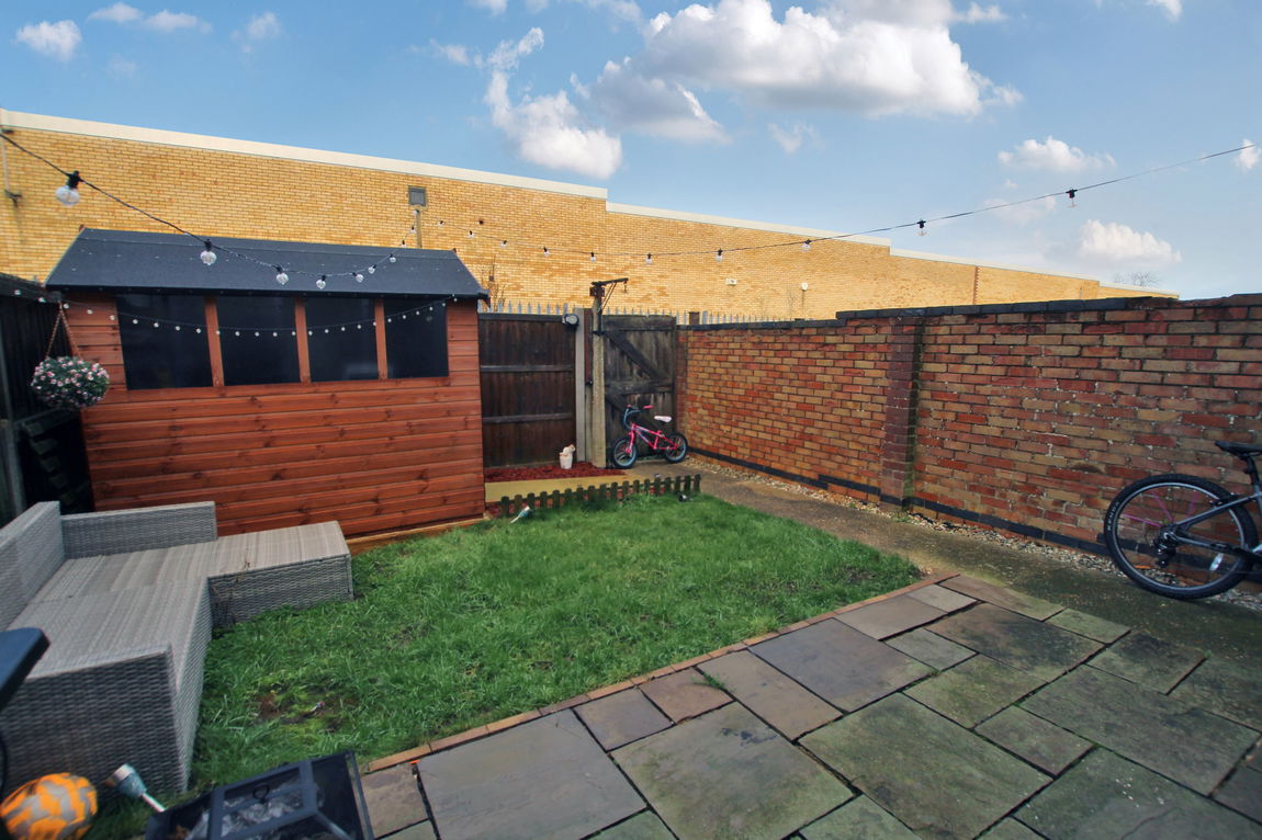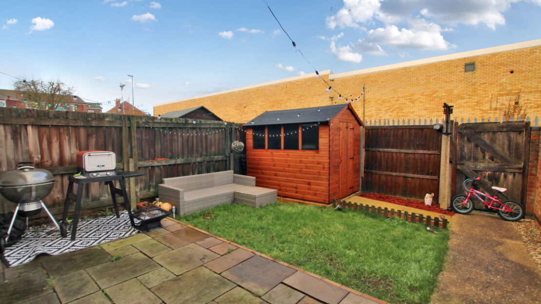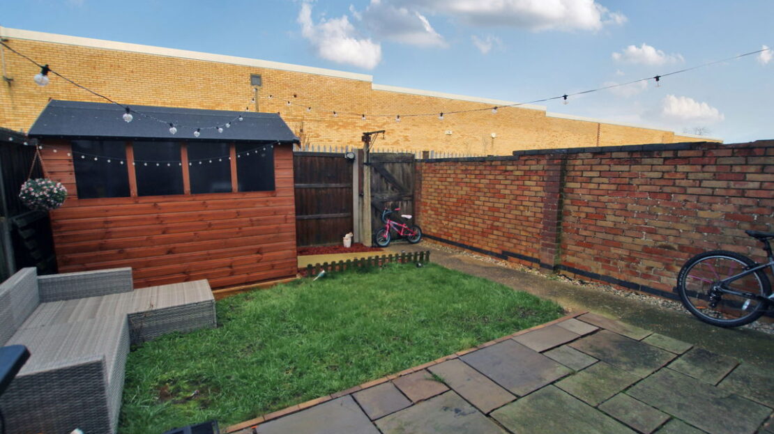 Mainly laid to lawn, paved patio, timber garden store/shed, enclosed by 6’ timber panel fencing, enclosed storage area to side of property.