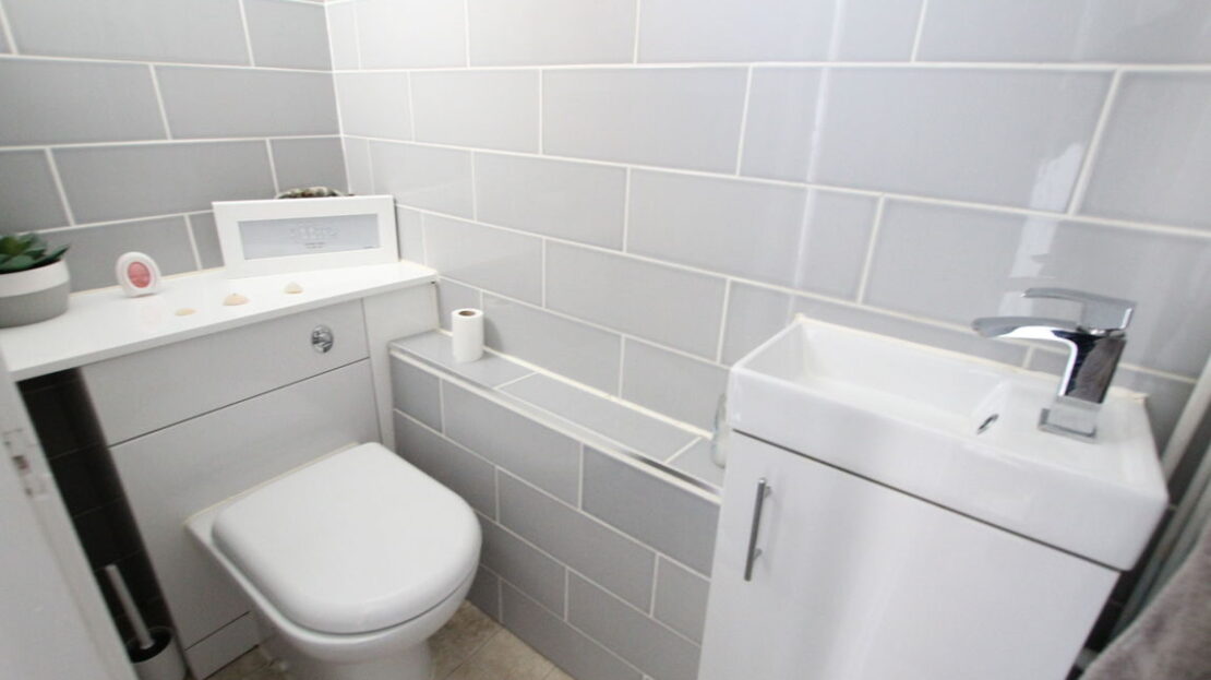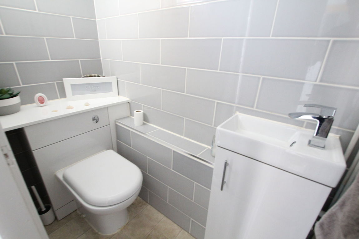 uPVC obscure double glazed window to front elevation, chrome vertical towel rail/radiator, two piece modern white suite comprising of low level W.C, wash hand basin, tiling to splash areas.