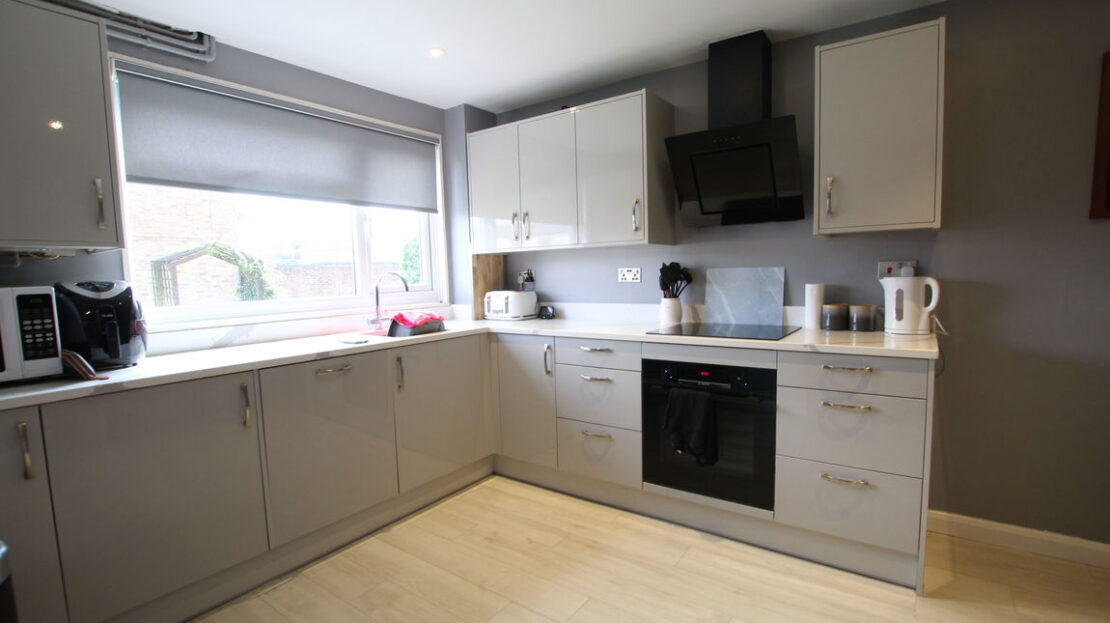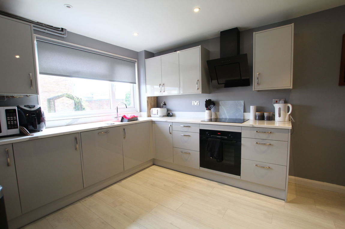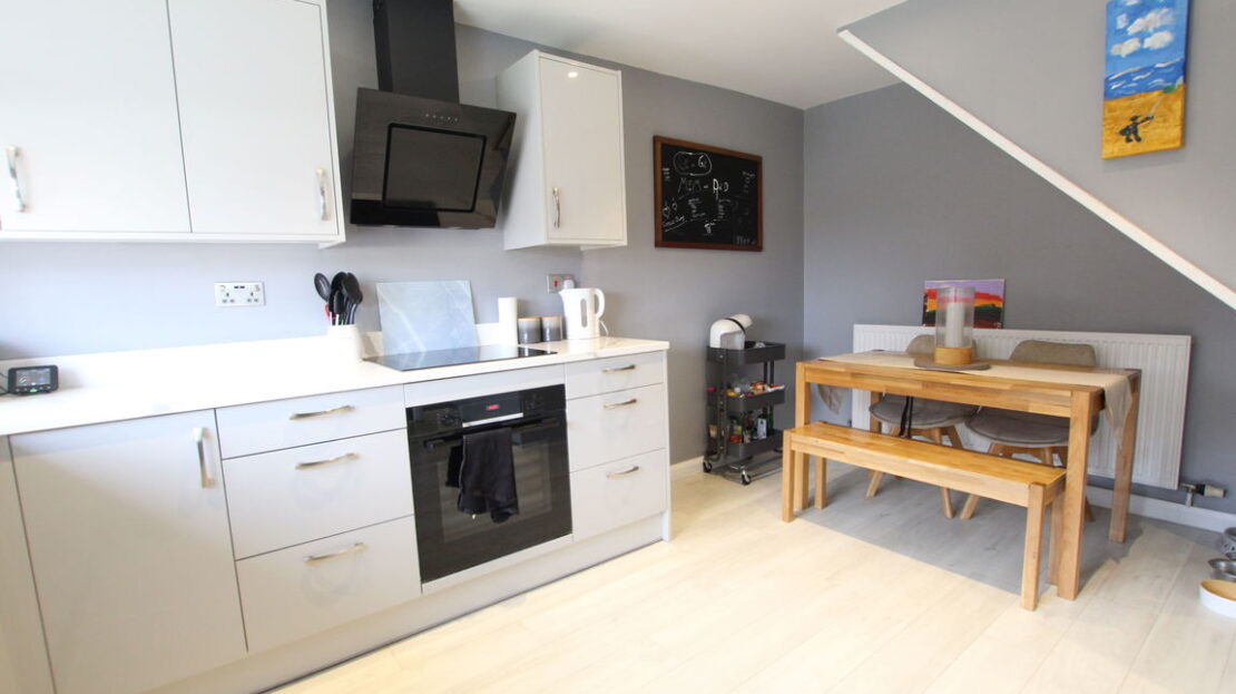 uPVC double glazed window to front elevation, single panel radiator, modern fitted kitchen comprising of single drainer sink unit with mixer tap over, quartz work surfaces, range of base units incorporating built-in electric hob and electric oven, built-in dish washer, built-in washing machine, built-in fridge freezer, tiling to splash areas, matching range of wall mounted units incorporating extractor hood, ideal area for table and chairs.