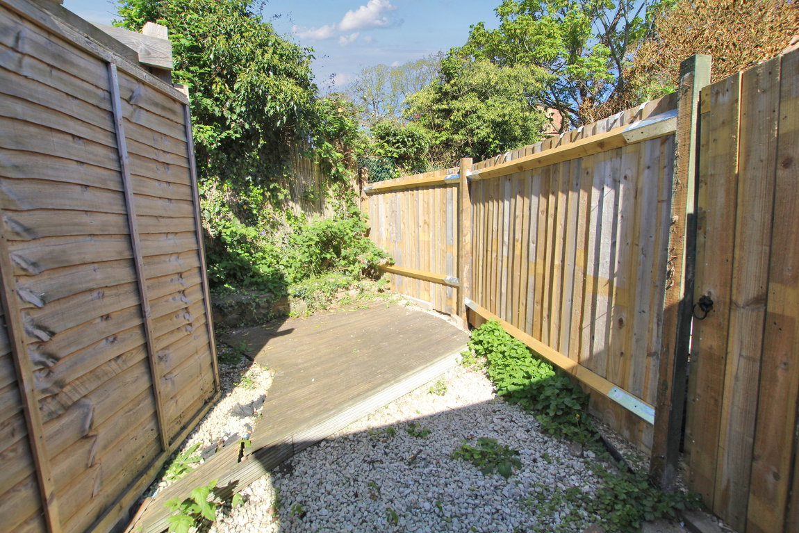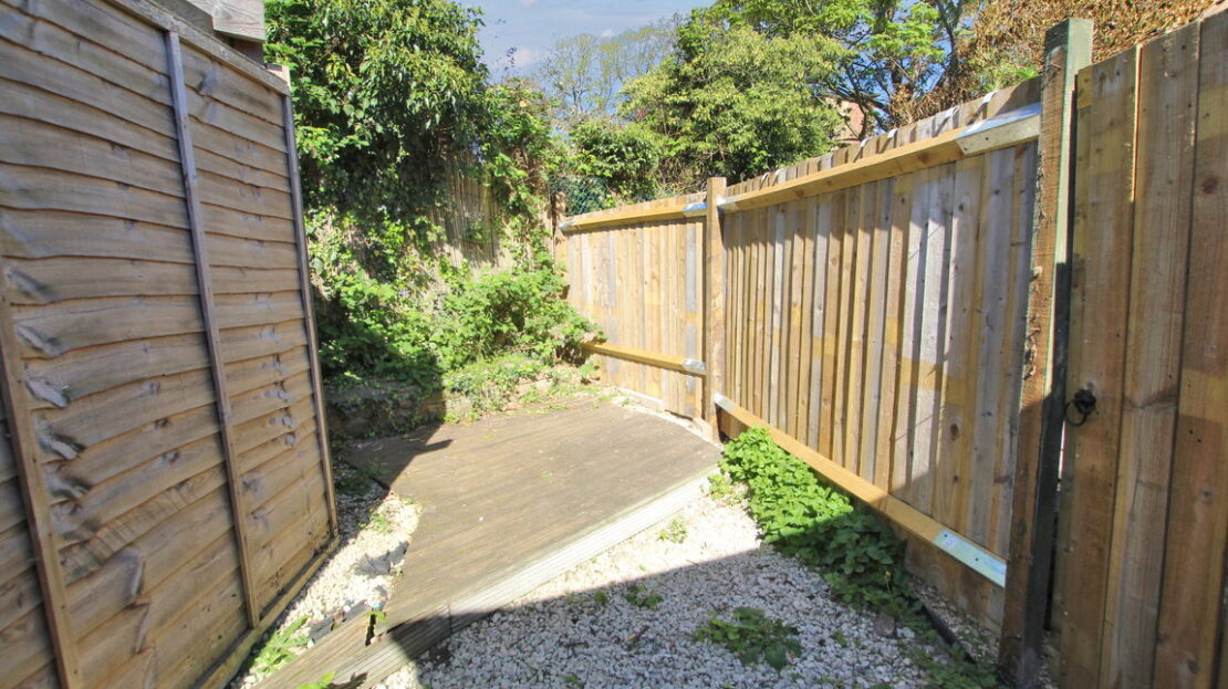 To the rear, the property features a quaint cottage-style garden, perfect for relaxing or entertaining, offering an outdoor space with a mix of decking and low maintenance gravel areas, surrounded by fencing.