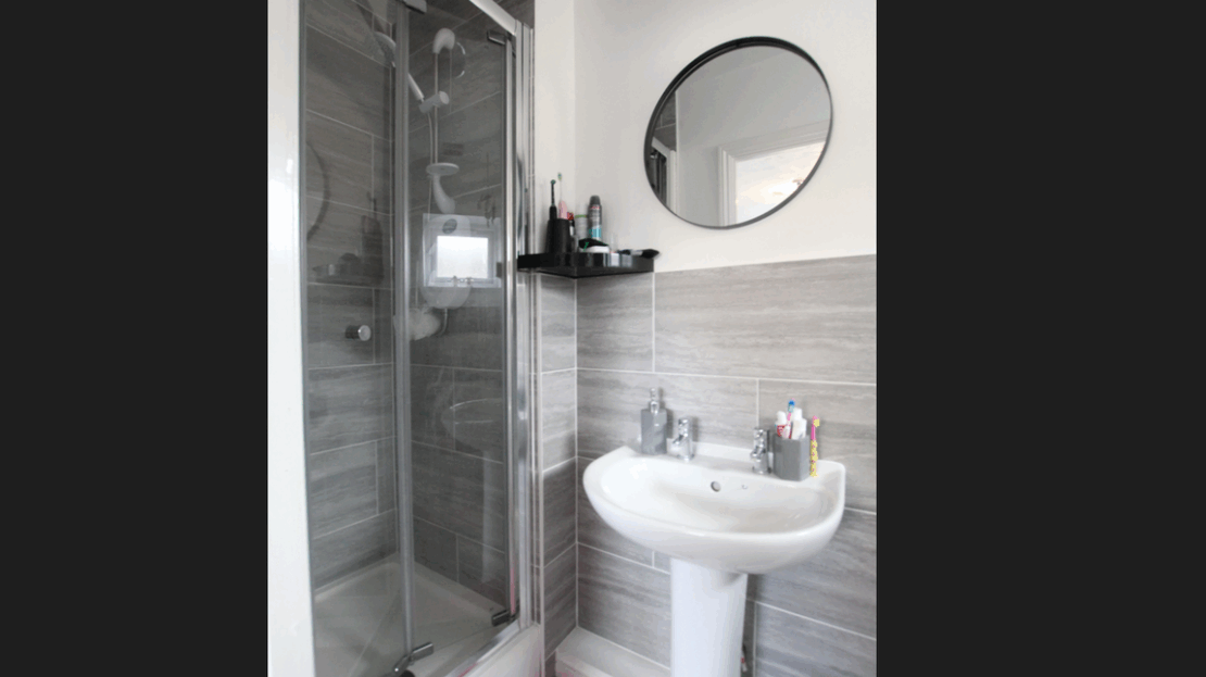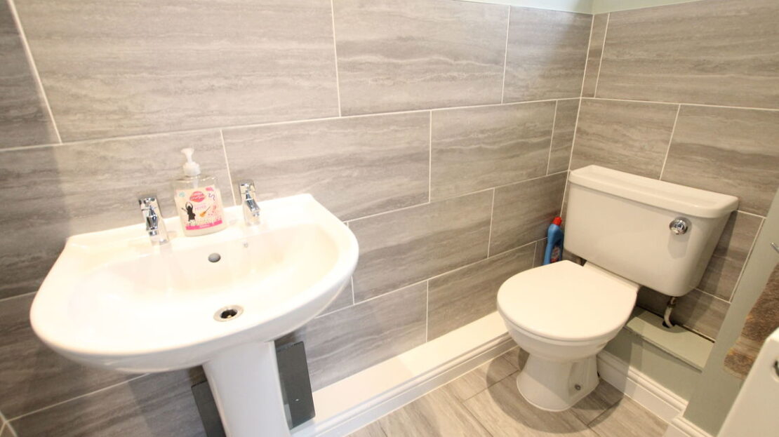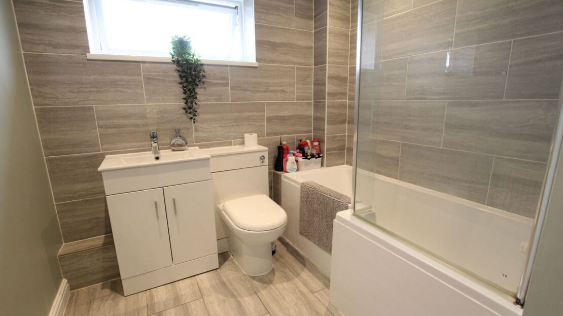 uPVC double glazed obscured window to side elevation, single panel radiator, fitted modern three piece suite comprising low level WC, wash hand basin, fully tiled shower cubicle with ‘Mira’ electric shower over, tiled to all splash areas, extractor fan.