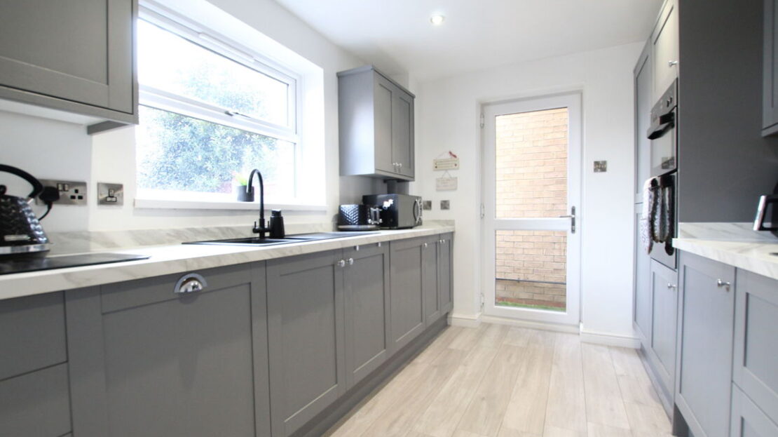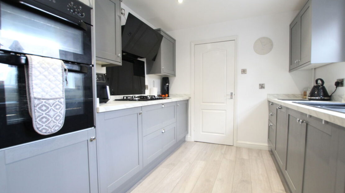 uPVC double glazed window to rear elevation, further uPVC double glazed obscure door to side elevation, re fitted modern kitchen comprising of granite sink with mixer tap over, work surfaces, range of base units incorporating built in five burner gas hob, two built in ovens, built in fridge/freezer, built in dishwasher, space and plumbing for washing machine, tiling to splash areas, range of wall mounted units incorporating fitted extractor hood.