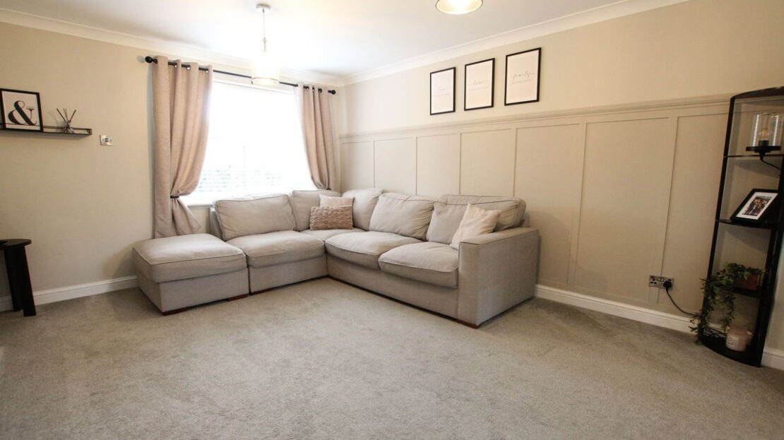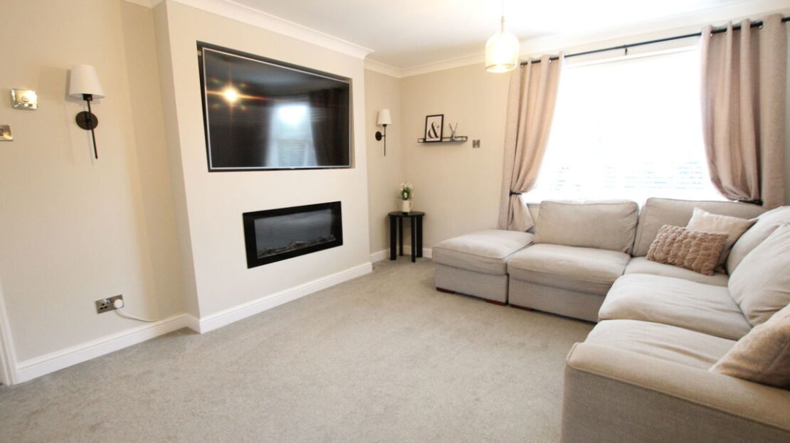 uPVC double glazed window to front elevation, two single panel radiators, coving to ceiling, feature ‘media’ wall with space for flush fit TV and feature ornamental inset electric fire, double doorway to: