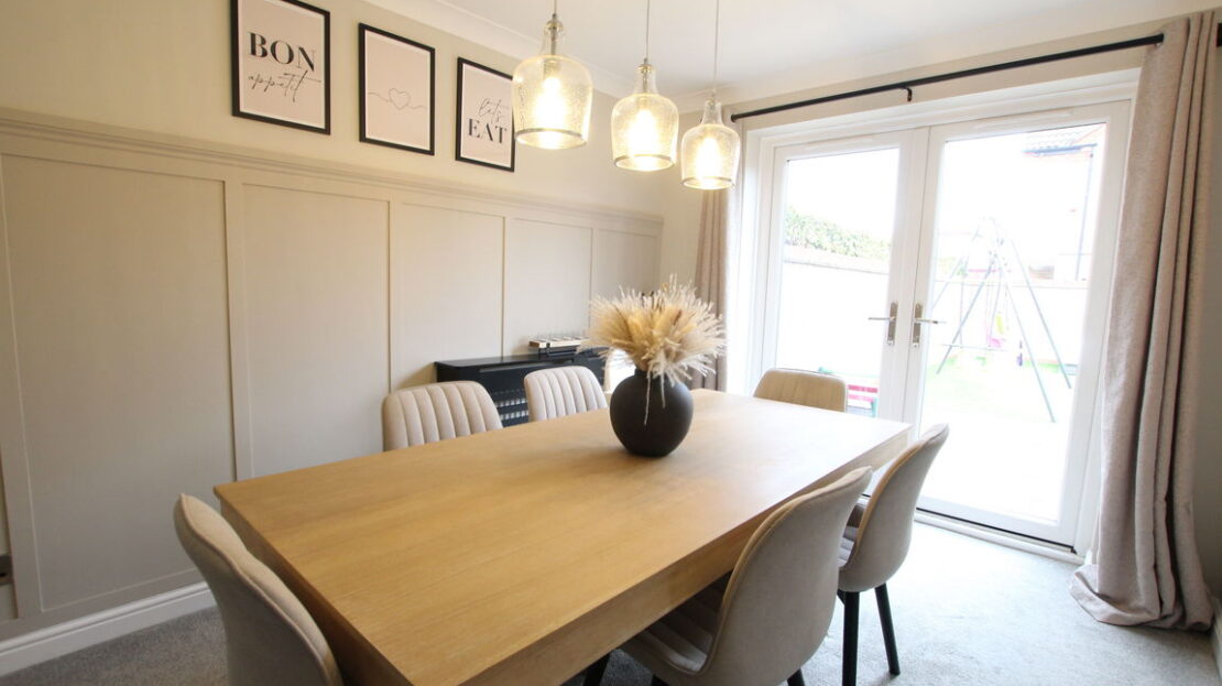 uPVC double glazed sliding patio doors to rear elevation, single panel radiator, coving to ceiling, wood effect flooring, door to: