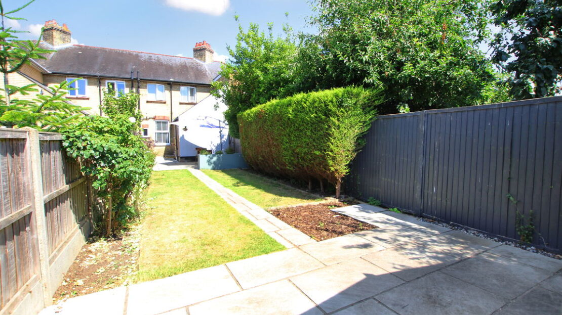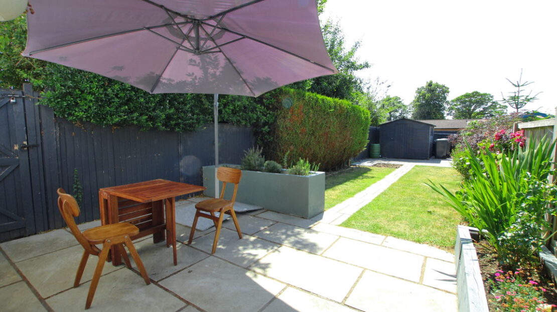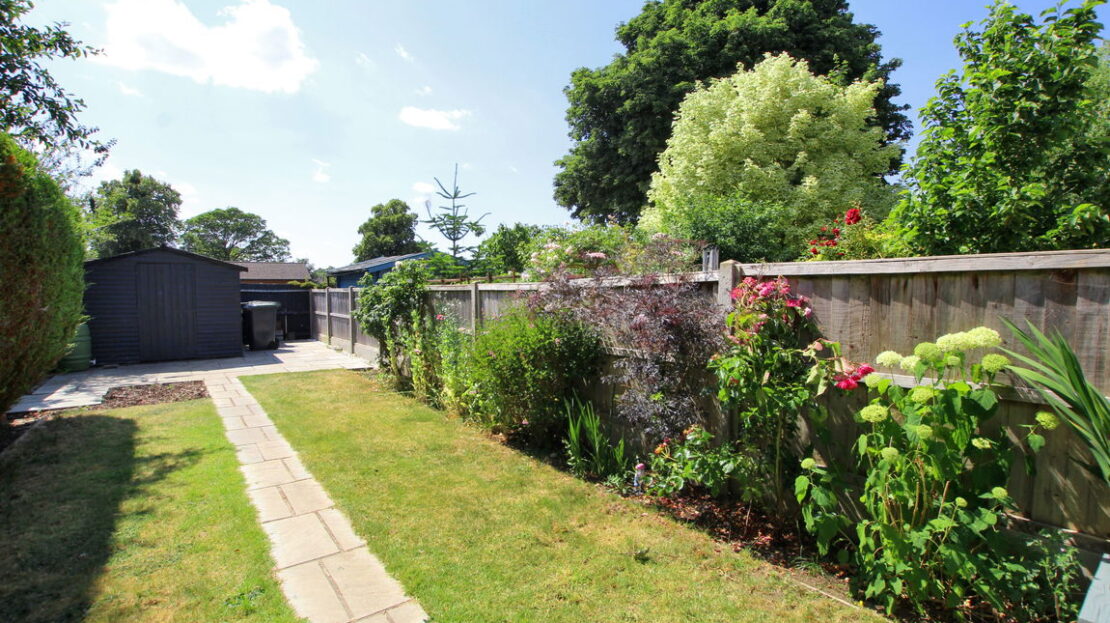Mainly laid to lawn, paved patio, timber garden store/shed, enclosed by 6′ timber panel fencing.