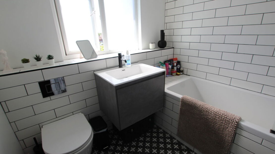 uPVC double glazed window to rear elevation, vertical towel rail/radiator, three piece suite comprising of low level W.C, wash hand basin, panel bath with shower/mixer tap over, tiling to splash areas.
