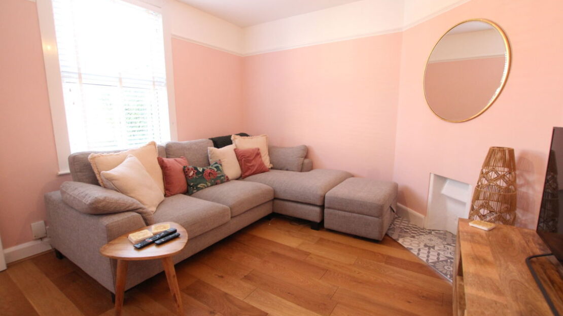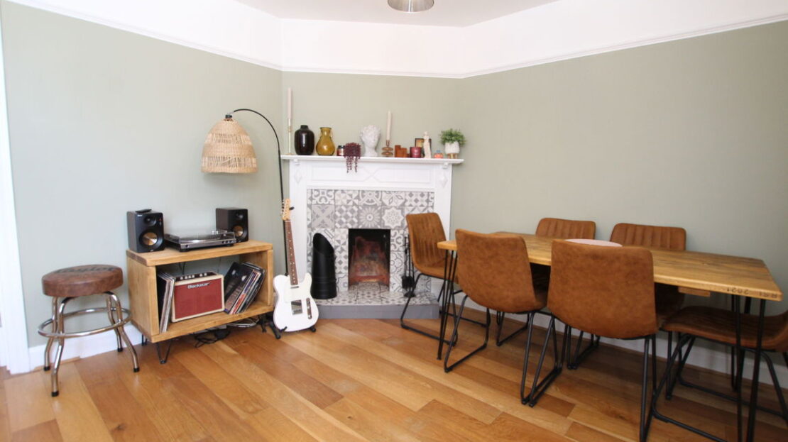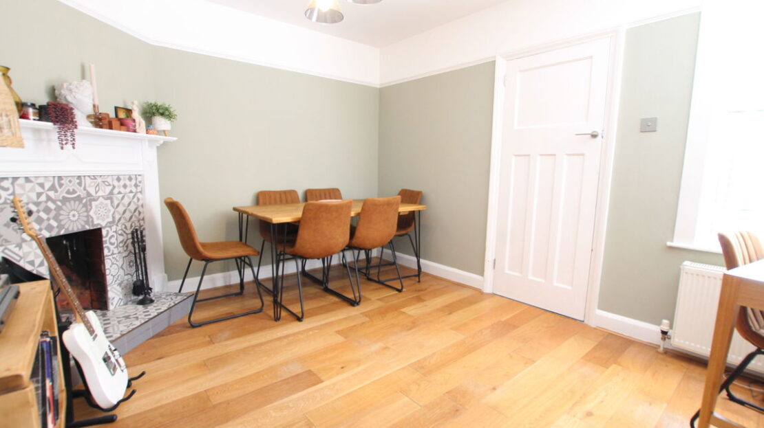 uPVC double glazed window to rear elevation, double panel radiator, continued laminated wood effect flooring, tiled surround fireplace.