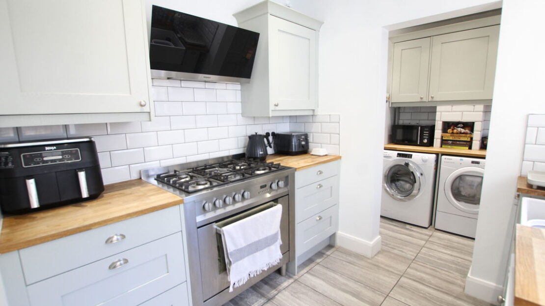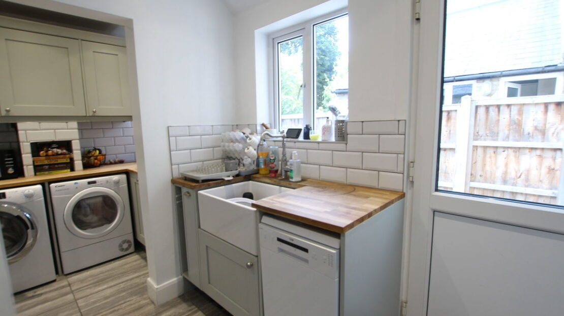uPVC double glazed window and door to side elevation, continued range of base units, work surfaces, plumbing for washing machine, space for tumble dryer, space for fridge/freezer, wall mounted boiler.