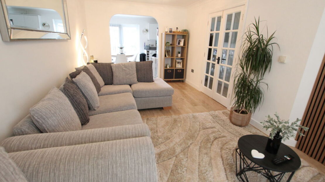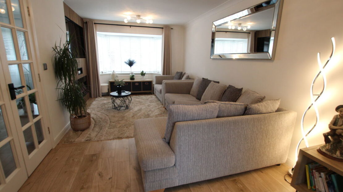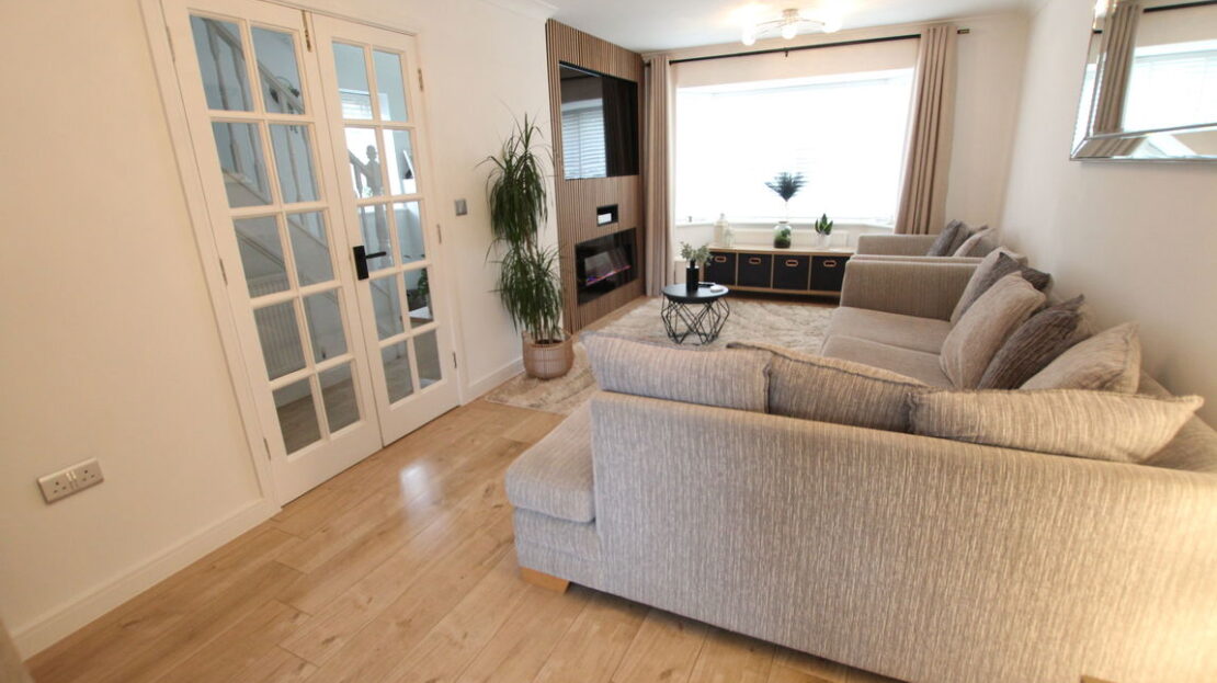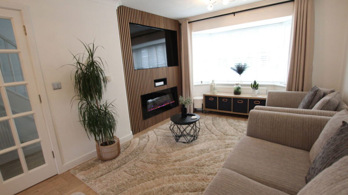 uPVC double glazed bay window to front elevation, double panel radiator, feature media wall with recess for flat screen TV plus a fitted electric illuminated flame effect base fire, laminated wood effect flooring, coving to ceiling.