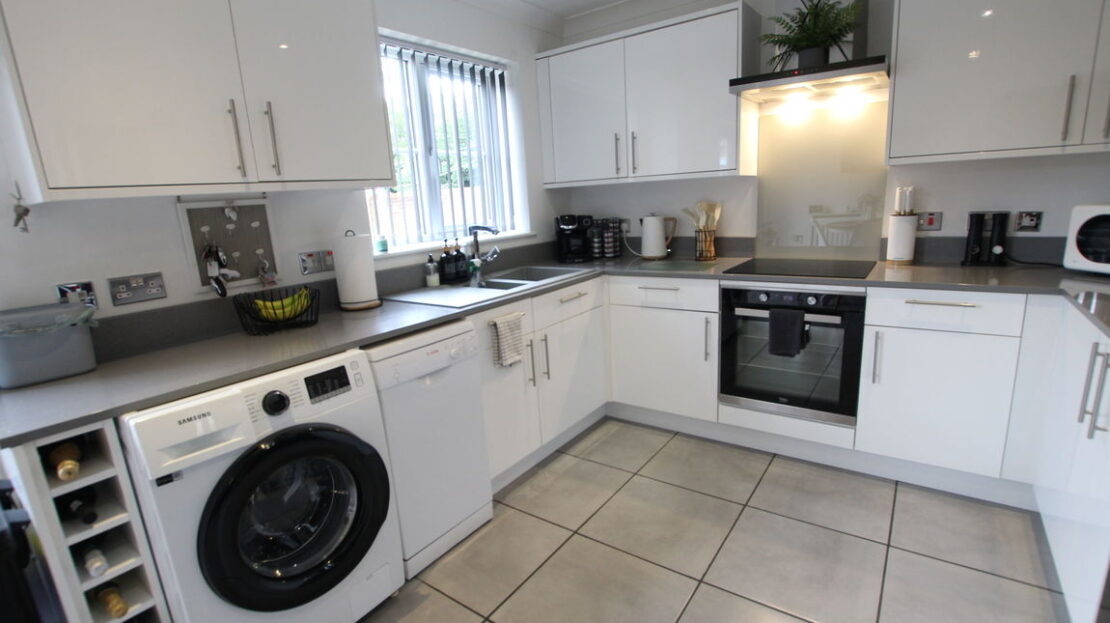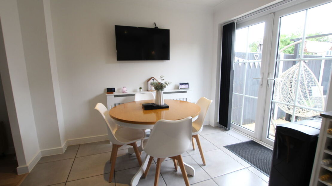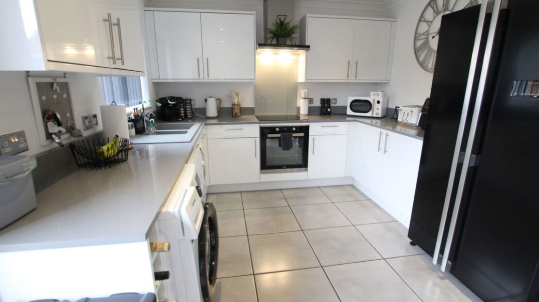 uPVC double glazed window to rear elevation, twin uPVC double glazed patio doors to rear elevation single panel radiator, extensive modern fitted kitchen comprising of single drainer sink unit with mixer tap over, quartz effect work surfaces, range of base units incorporating built-in electric hob and electric oven with separate grill, plumbing for slim dish washer, plumbing for washing machine, space for fridge freezer, matching range of wall mounted units incorporating stainless steel extractor hood, ideal area for table and chairs.