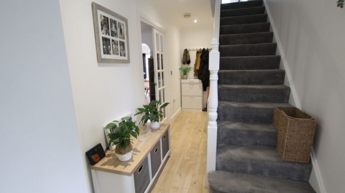 uPVC double glazed window to side elevation single panel radiator, stairs rising to first floor, laminated wood effect flooring, coving to ceiling, fitted meter cupboard, communicating doors to: