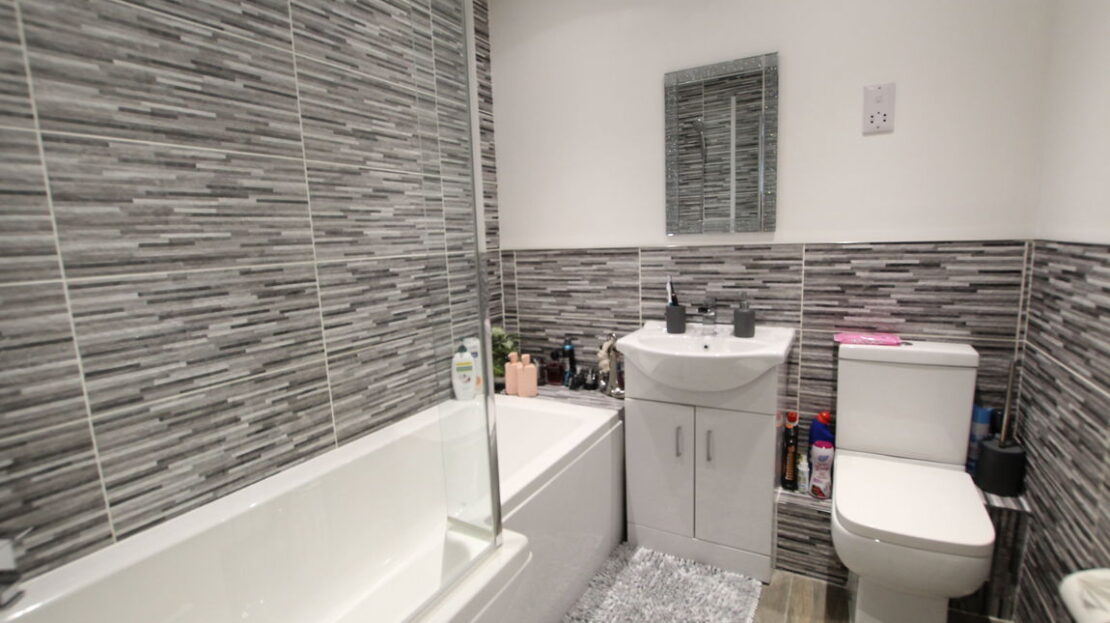 Refitted luxury bathroom with vertical towel rail/radiator, three piece modern suite comprising of low level W.C, wash hand basin, ‘P’ shaped panel bath with shower/mixer tap over and fitted screen, tiling to splash areas.