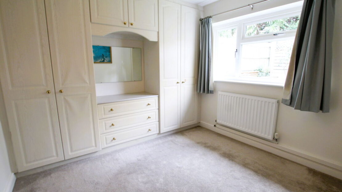 uPVC double glazed window to rear elevation, single panel radiator, fitted twin wardrobes and dressing table with units above and below.