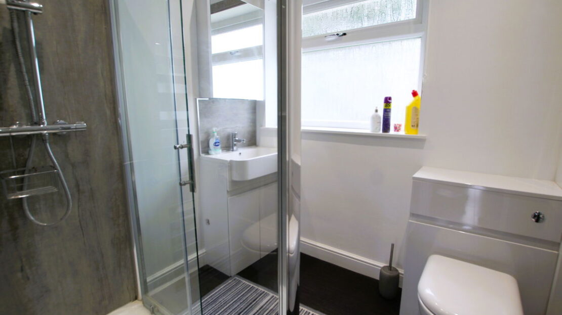 Now redesigned to a shower room with uPVC obscure double glazed window to rear elevation, vertical towel rail/radiator, refitted three piece white suite comprising of low level W.C, wash hand basin on vanity unit, 1000mm walk in shower with ‘Watering Can’ showerhead plus second rinsing attachment.