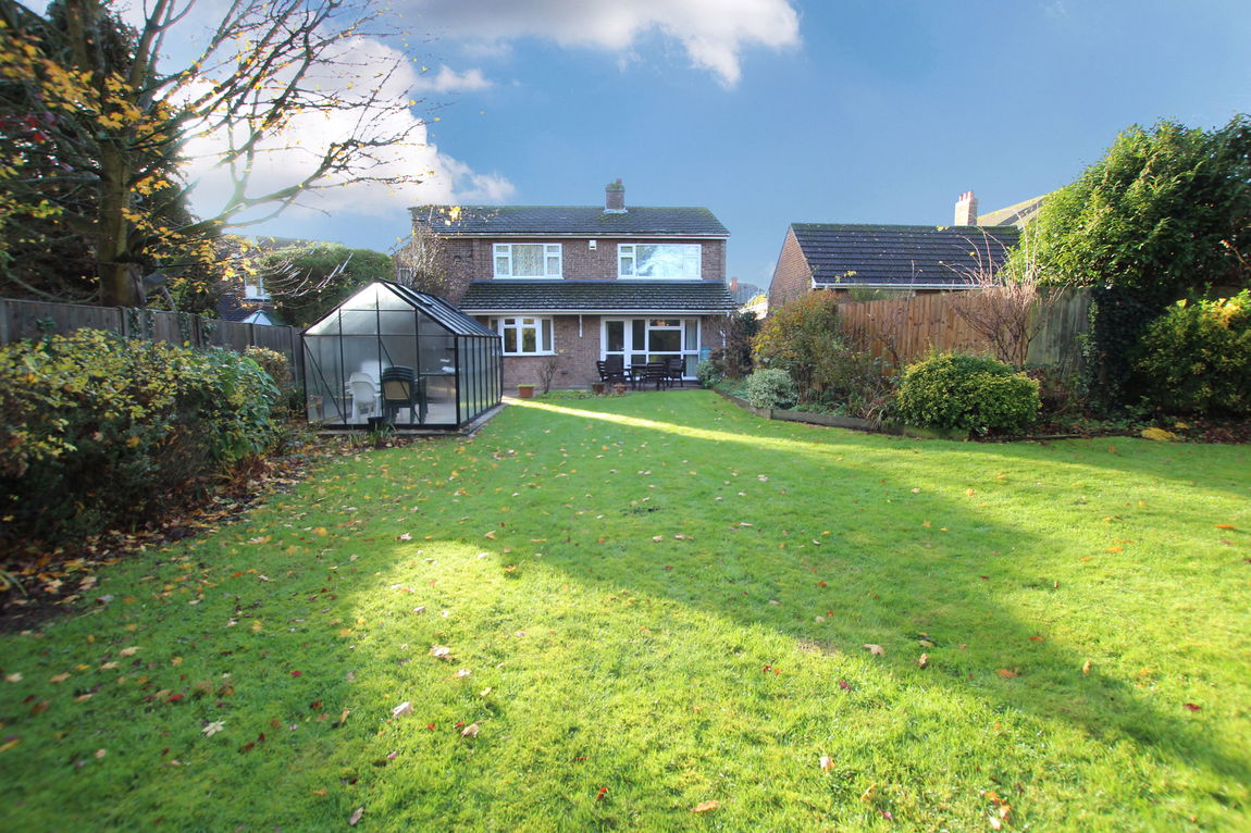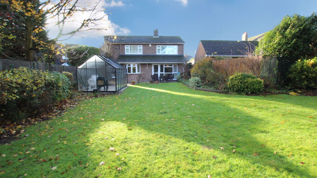 An impressive and established generous enclosed rear garden mainly laid to lawn, paved patios, timber garden store/shed, greenhouse.