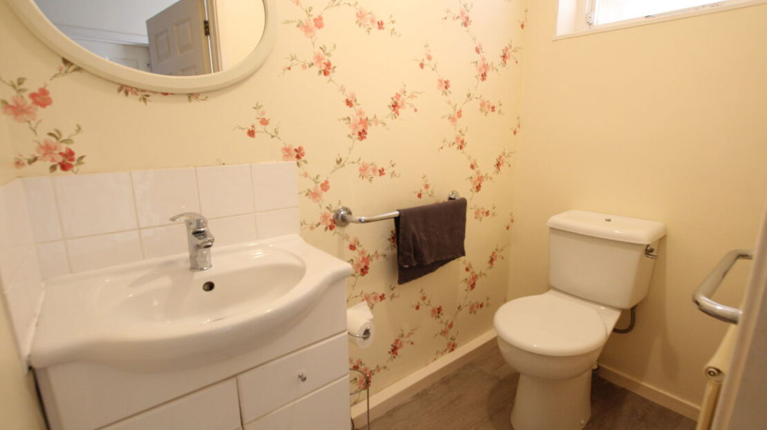 Single panel radiator, two piece modern white suite comprising of low level W.C, wash hand basin set into a vanity unit, tiling to splash areas.
