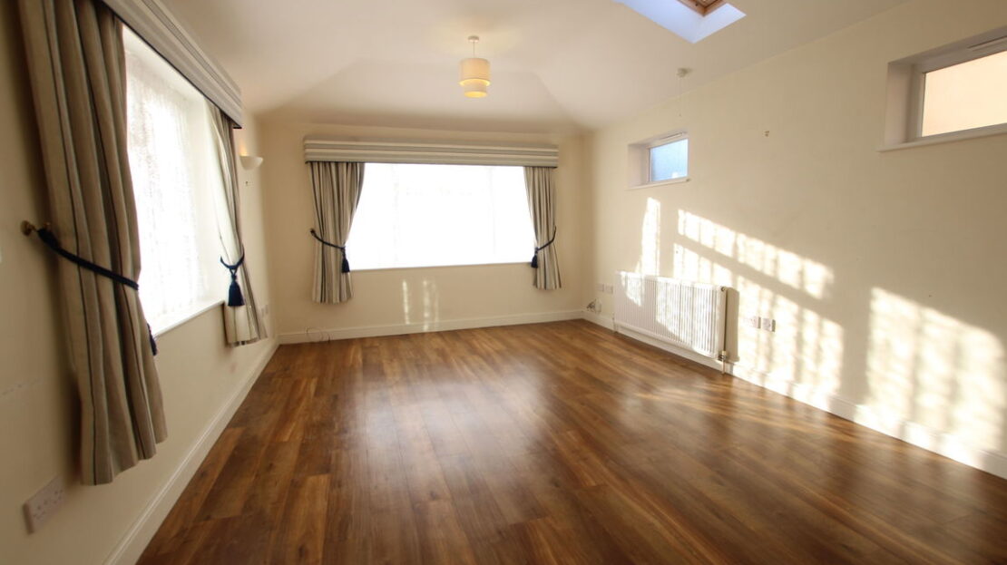 An impressive triple aspect versatile additional reception room with uPVC double glazed windows to front and both side elevations, plus twin Velux windows to the feature vaulted roof, two double panel radiators, laminated wood effect flooring.