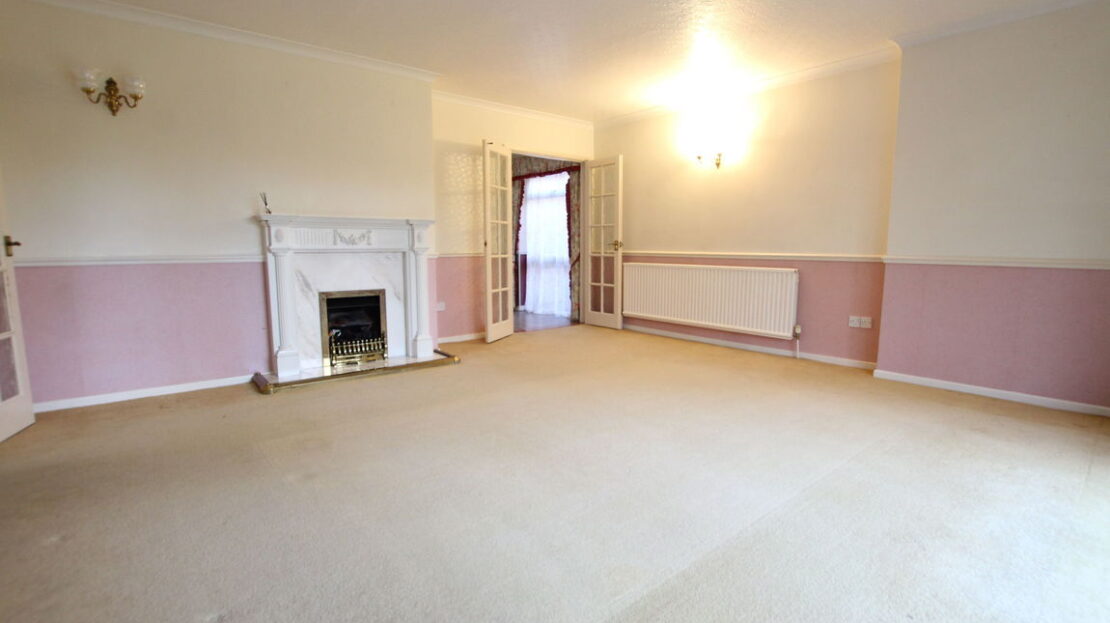 uPVC double glazed picture window and door to rear elevation, two double panel radiators, living flame style gas fire set into marble effect surround, coving to ceiling, double doors to: