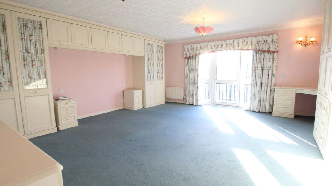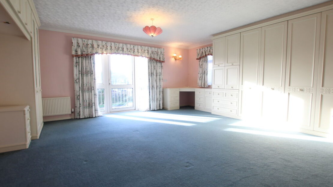 An impressive tripe aspect room with uPVC double glazed windows to rear and side elevation, plus uPVC double glazed picture window with door to a feature front balcony with iron safety rail, two double panel radiators, fitted extensive bedroom furniture including wardrobes, drawers, dressing table and bedside cabinets, coving to ceiling.