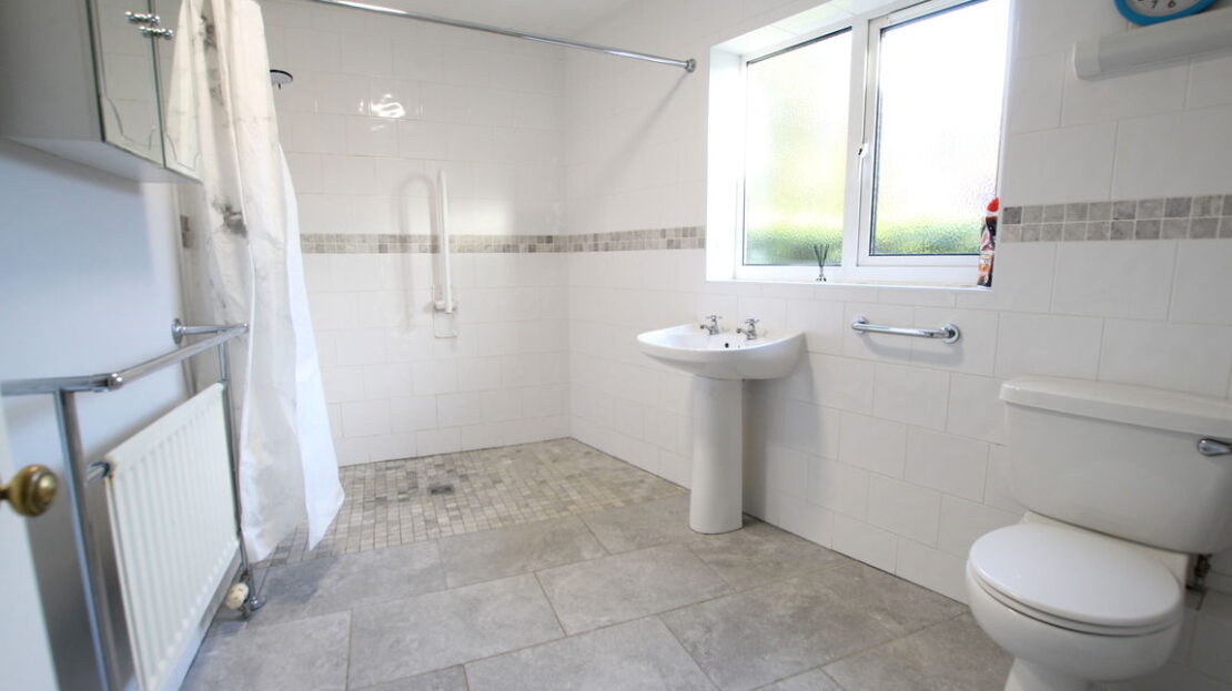 A close coupled bespoke wet room with uPVC obscure double glazed window to side elevation, single panel radiator with towel rail, white low level W.C, wash hand basin, fully tiled shower area with floor level easy access soakaway and Mira electric shower over, tiled floor.
