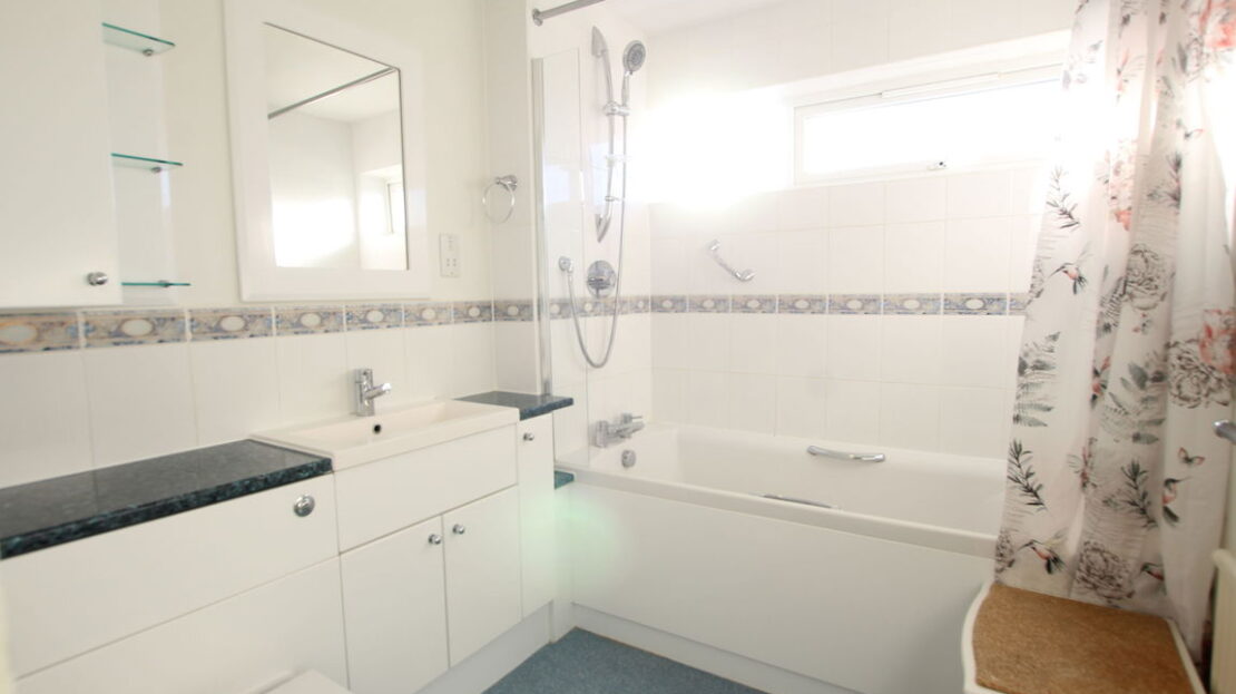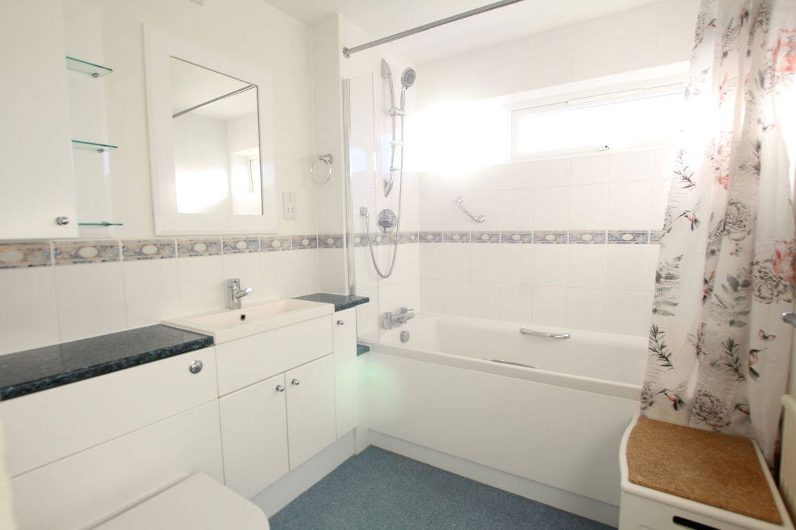 uPVC obscure double glazed window to front elevation, single panel radiator, three piece white modern suite comprising of low level W.C and wash hand basin set into vanity unit, panel bath with mixer tap and separate shower over, tiling to splash areas.