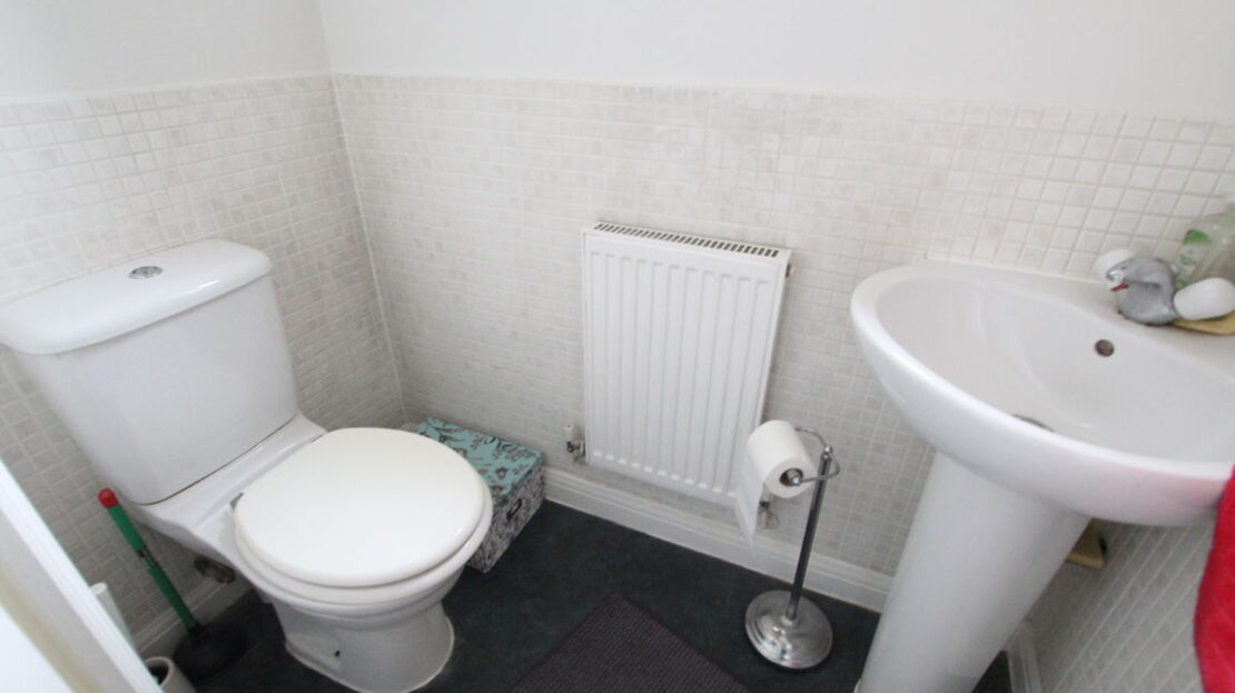 uPVC obscure double glazed window to side elevation, single panel radiator, two piece suite comprising of low level W.C, wash hand basin, tiling to dado height, laminated wood effect flooring.