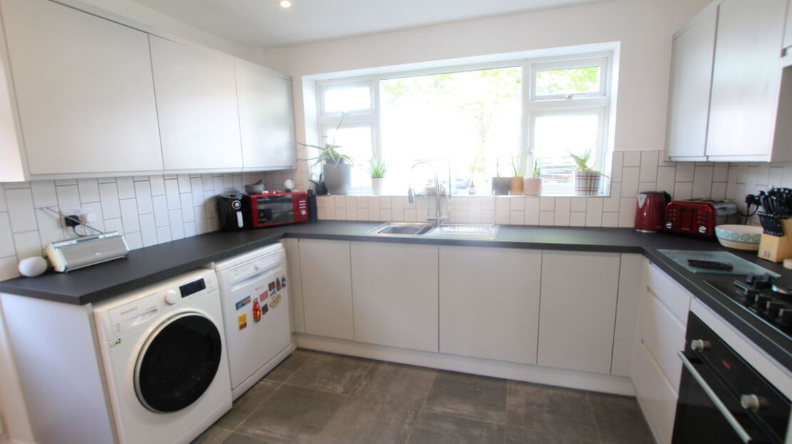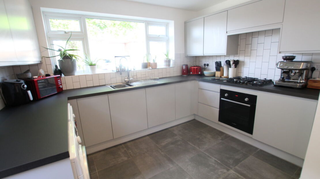 Dual aspect room with uPVC double glazed windows to front and side elevations, uPVC double glazed side door to driveway, double panel radiator, extensive modern refitted kitchen comprising of single drainer stainless steel sink unit with mixer tap over, modern work surfaces, range of base units incorporating built-in stainless steel Bosch gas hob and Bosch electric oven, plumbing for dish washer, plumbing for washing machine, built-in fridge, built-in freezer, tiling to splash areas, matching range of wall mounted units incorporating extractor hood, ideal area for table and chairs, tiled floor.