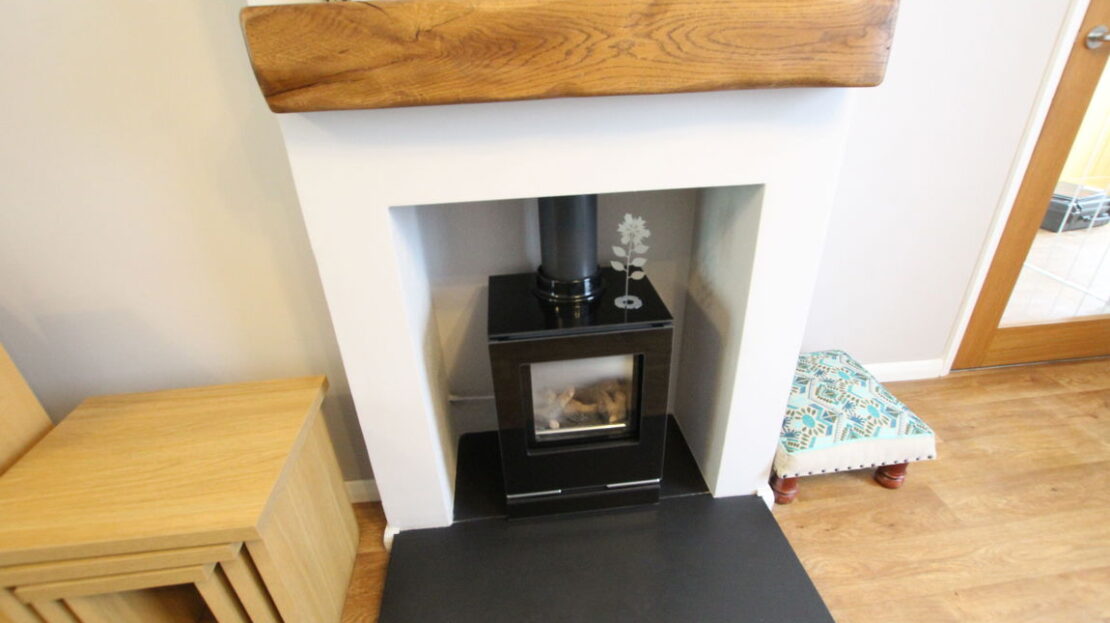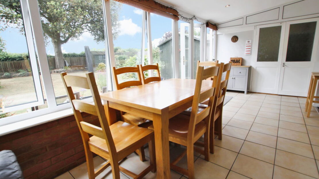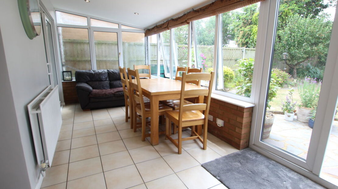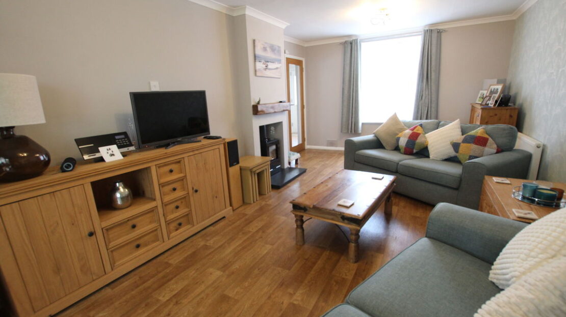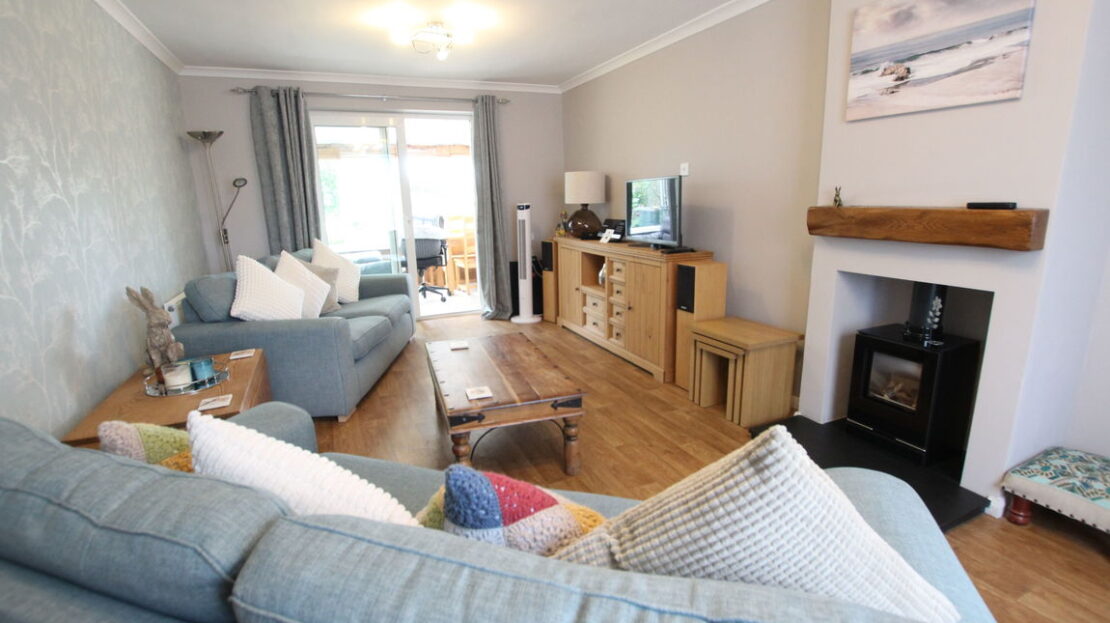 Dual aspect room with uPVC double glazed window to front elevation and uPVC double glazed patio door to rear elevation, feature inset wood burner style ‘living flame’ gas fire, two single panel radiators, wood effect flooring, coving to ceiling.