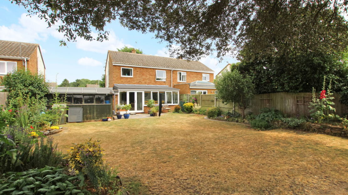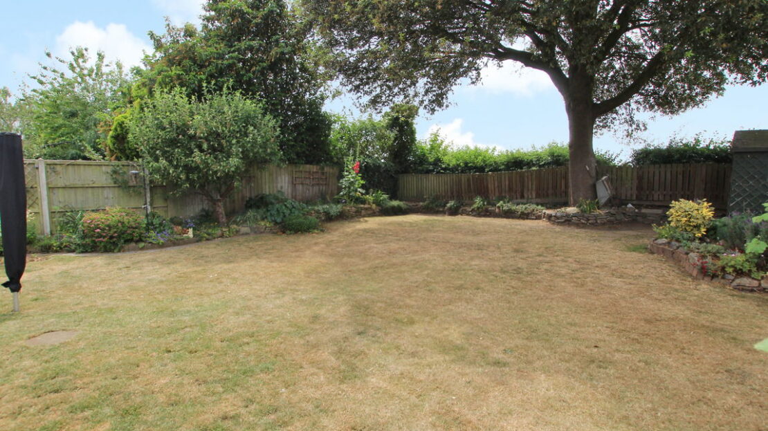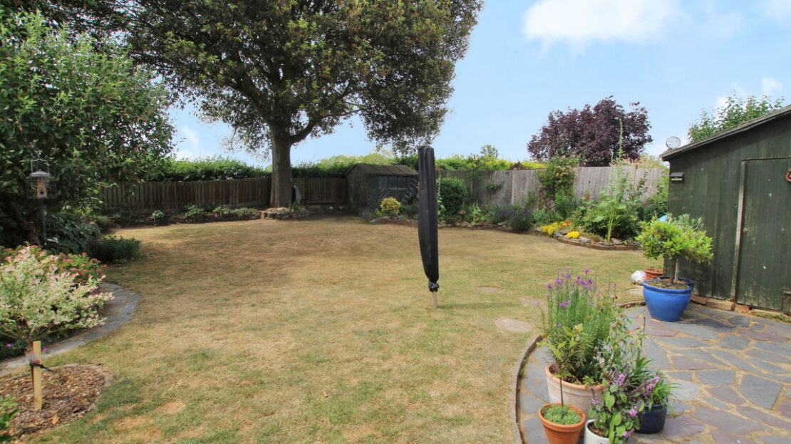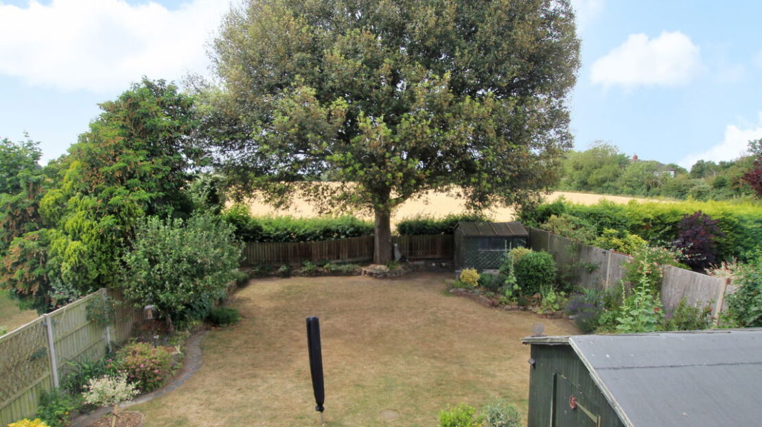 Established well stocked rear garden backing onto open fields, lawn, paved patio, timber garden store/shed to rear plus 15’6 X 7’8 timber shed.