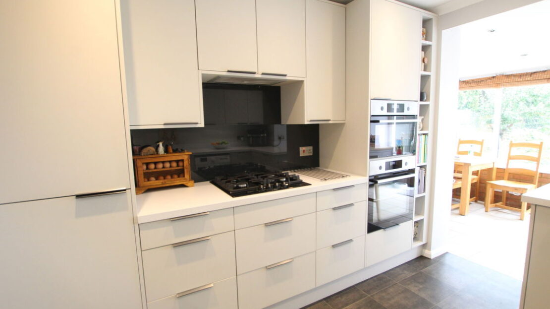 Luxury refitted kitchen comprising of stainless steel sink unit with mixer tap over, modern work surfaces, range of base units incorporating built-in Bosch gas hob and Zanussi electric combo microwave stainless steel oven and electric fan oven, built-in AEG dish washer, built-in fridge freezer, plumbing for washing machine, fitted breakfast end bar area, matching range of wall mounted units incorporating extractor hood, and wine racks, door to: