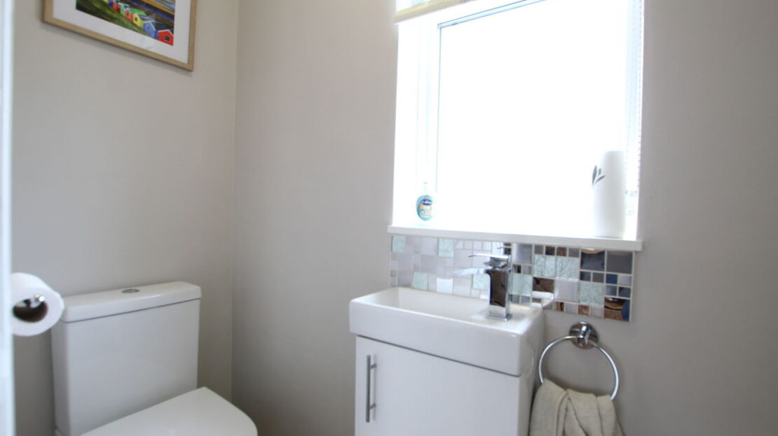 uPVC obscure double glazed window to side elevation, refitted two piece suite comprising of low level W.C, wash hand basin, tiling to splash areas, coving to ceiling.
