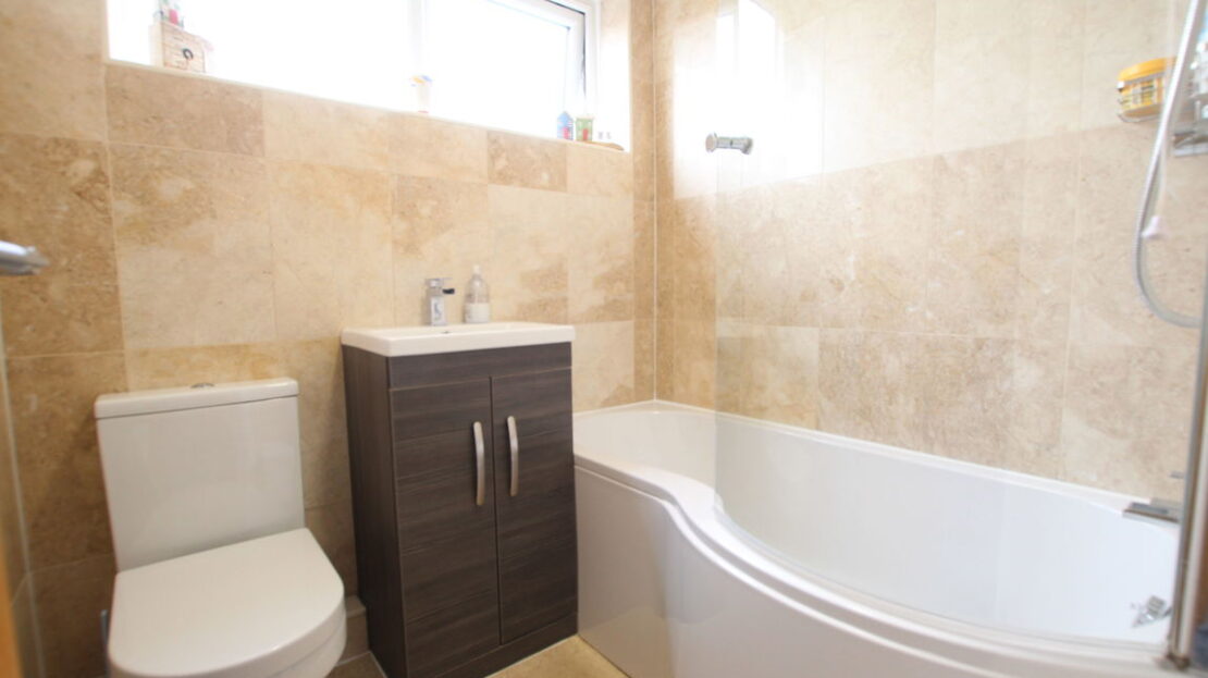 Fully tiled luxury refitted bathroom with uPVC obscure double glazed window to side elevation, chrome vertical towel rail/radiator, low level W.C, wash hand basin, panel ‘P’ shaped bath with mixer taps and separate shower over plus curved screen.