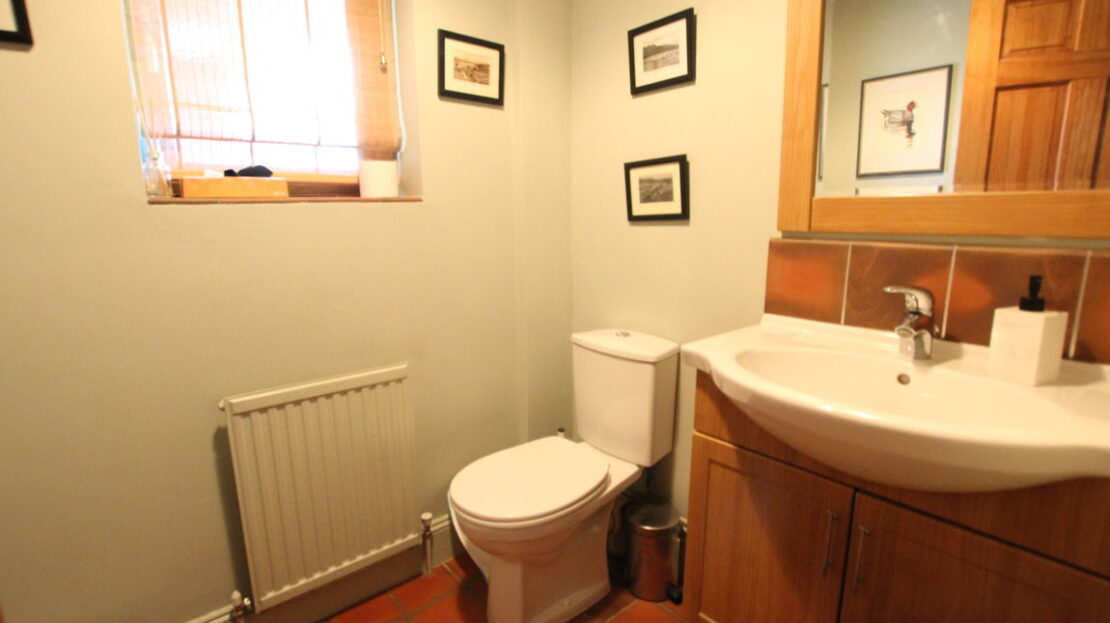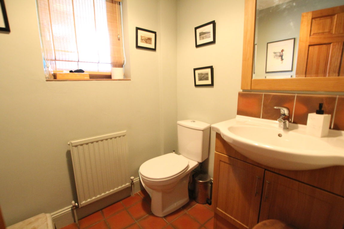 uPVC obscure double glazed window to front elevation, single panel radiator, two piece white suite comprising of low level W.C, wash hand basin with vanity unit, tiling to splash areas, tiled floor.