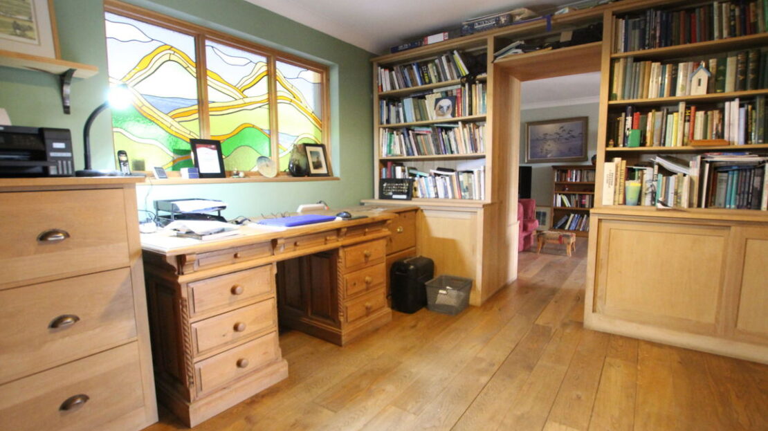 Feature stained glass internal window, double panel radiator, continued solid wood flooring, fitted bookcases.