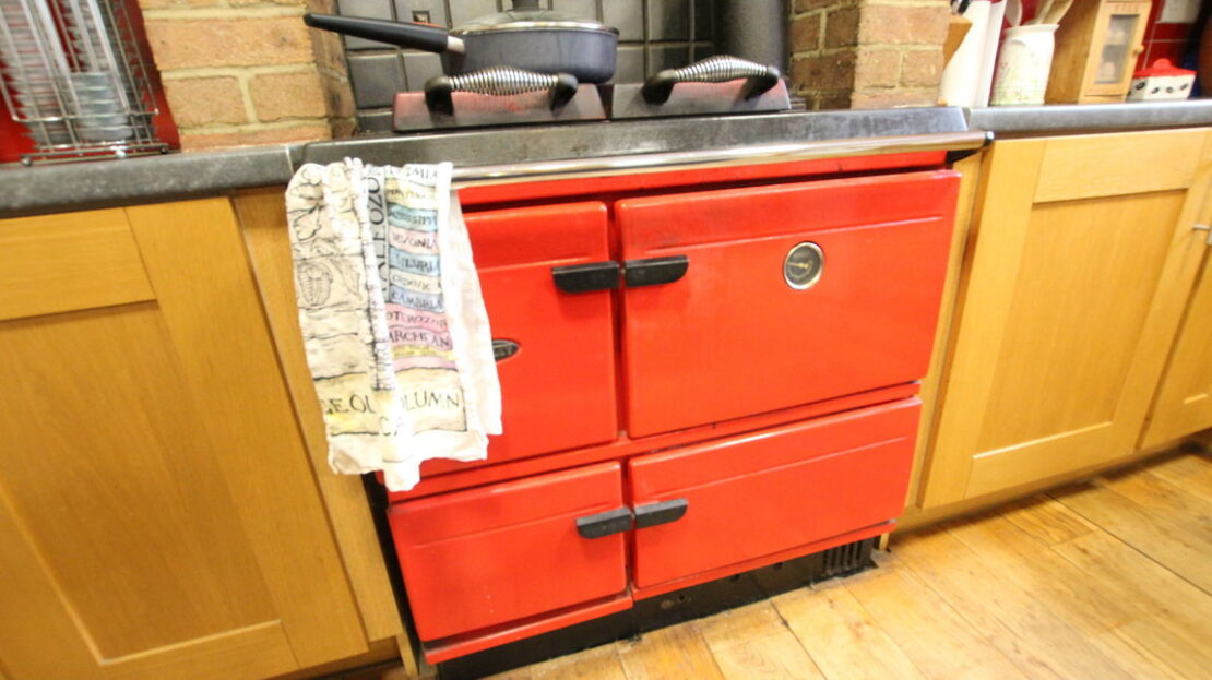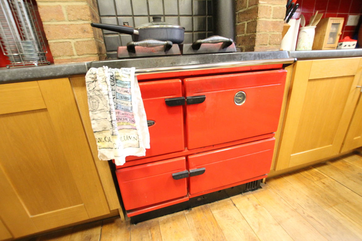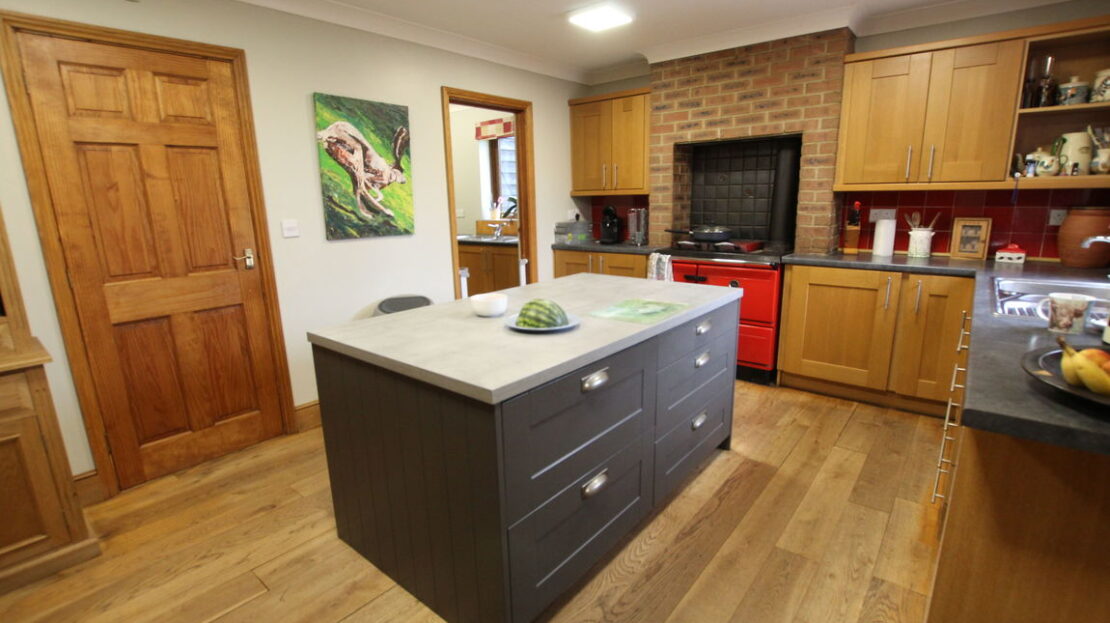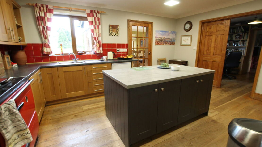 uPVC double glazed window to rear elevation, fitted kitchen comprising of single drainer stainless steel sink unit with mixer tap over, roll top work surfaces, freestanding Stanley oil cooker a central heating cooker with an integral boiler for heating producing hot water. It has a second slow-cooking oven in addition to the main roasting oven, space for fridge, tiling to splash areas, matching range of wall mounted units, central island, continued wood flooring, door to: