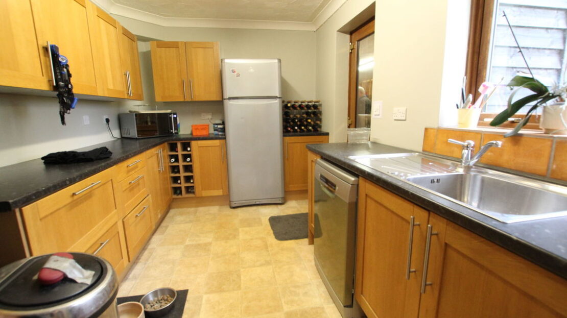 uPVC double glazed window and door to side elevation, continued range of base units incorporating single drainer stainless steel sink unit with mixer tap over, roll top work surfaces, plumbing for washing machine, space for freezer.