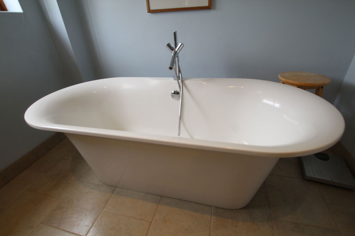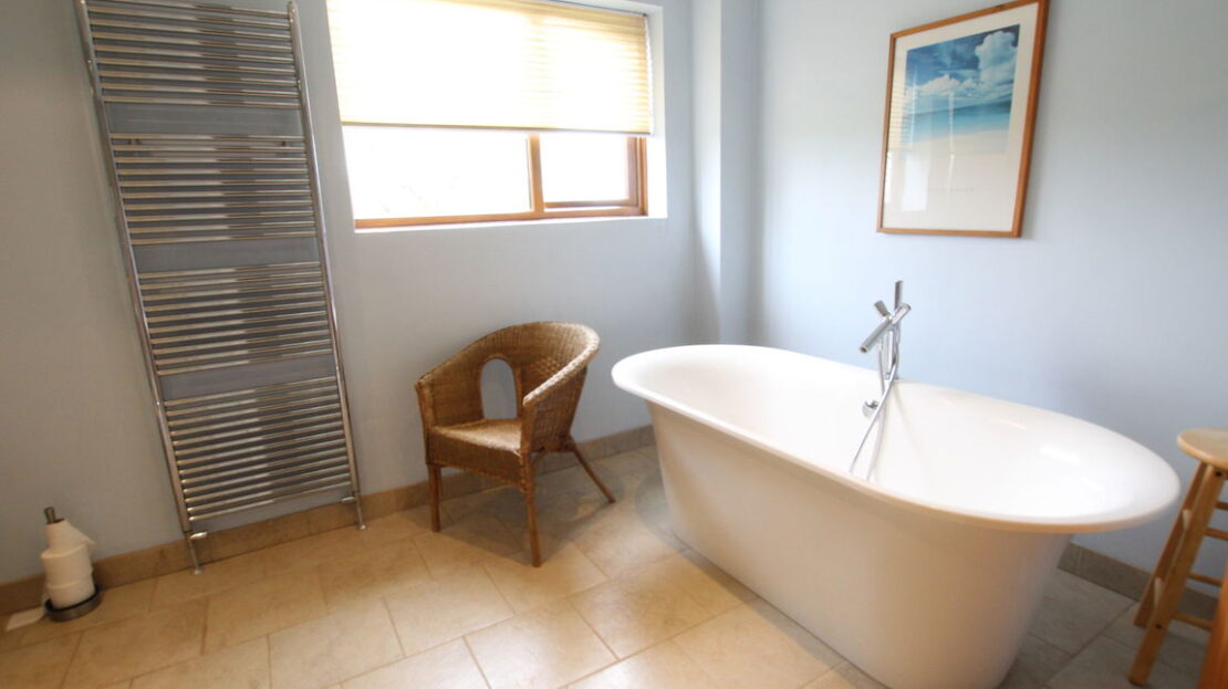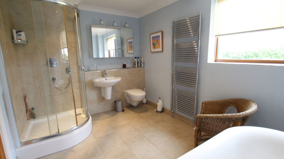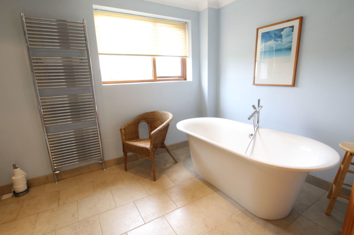 uPVC obscure double glazed window to rear elevation, chrome vertical towel rail/radiator, luxury fitted four piece suite comprising of low level W.C, wash hand basin, freestanding double ended bathtub, fully tiled separate shower cubicle.